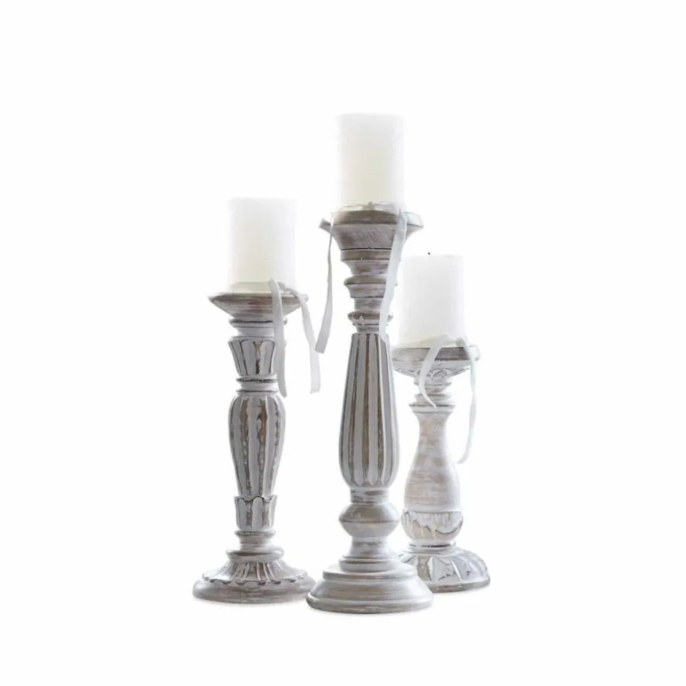 Drei sehr charmante Designs in verschiedenen Größen erhalten Sie in diesem wunderhübschen Set. Das Trio bezaubert mit romantischer Shabby-Note. Jedes Modell ist detailreich gearbeitet und verziert. Die eleganten Kerzenhalter bestehen aus wertvollem Mangoholz und Eisen. Ein authentisches Antik-Finish ziert sie und verleiht den Modellen eine nostalgische Note. Dank der Halterung für Kerzen lassen diese sich stabil und einfach einstellen. Einfach perfekt für heimelige Momente bei gemütlichem Kerzenlicht und ein sehr schöner Akzent für jedes Ambiente.