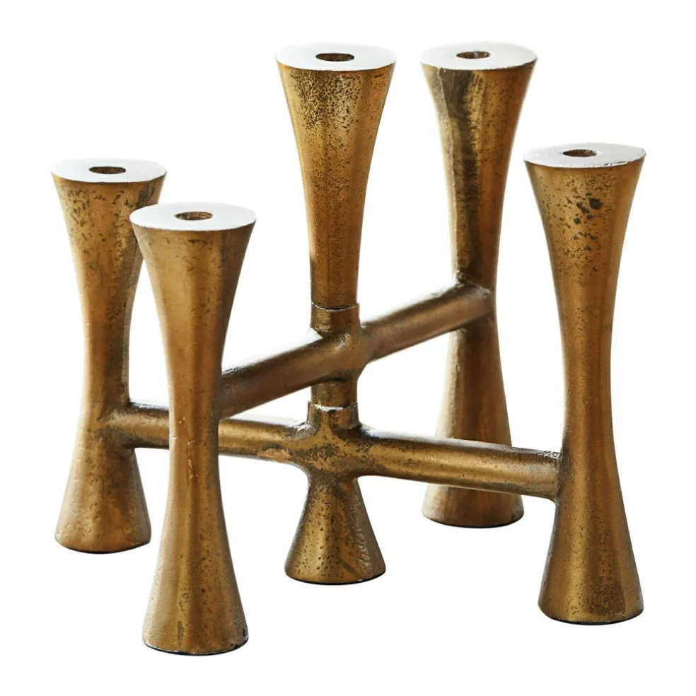 Dieser außergewöhnliche Kerzenständer bringt mit seiner geometrischen Form und dem Antikgold-Finish eine besondere Atmosphäre in Ihr Zuhause. Gefertigt aus Aluguss, ist er perfekt für filigrane Stabkerzen und ein echter Blickfang auf Ihrem Esstisch, Sideboard oder auf der Fensterbank. Das goldene Finish verleiht ihm einen Hauch von zeitlosem Luxus und fügt sich harmonisch in moderne sowie klassische Wohnstile ein. Er bringt Licht und Wärme in Ihr Zuhause, besonders zur festlichen Jahreszeit. Auch ohne Kerzen ist er durch sein einzigartiges Design ein stilvolles Deko-Objekt.