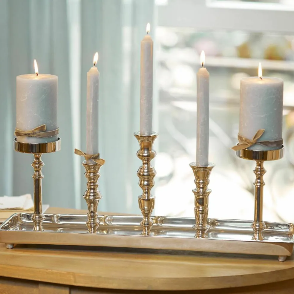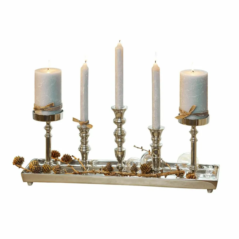 Erleben Sie die perfekte Kombination aus Stil und Funktionalität mit unserem exquisiten Kerzentablett. Die hochglänzend polierte Oberfläche reflektiert das Licht und verleiht jedem Raum einen Hauch von Luxus. Das Tablett ist ideal für Stab- und Stumpenkerzen, die nicht im Lieferumfang enthalten sind, und bietet zusätzlich Platz für saisonale Dekorationen, sodass Sie es individuell gestalten können. Die elegante Form und das raffinierte Design machen dieses Kerzentablett zu einem unverzichtbaren Highlight auf Ihrem Tisch oder Sideboard. Genießen Sie die warme, einladende Atmosphäre, die dieses hochwertige Dekorationsstück in Ihr Zuhause bringt.