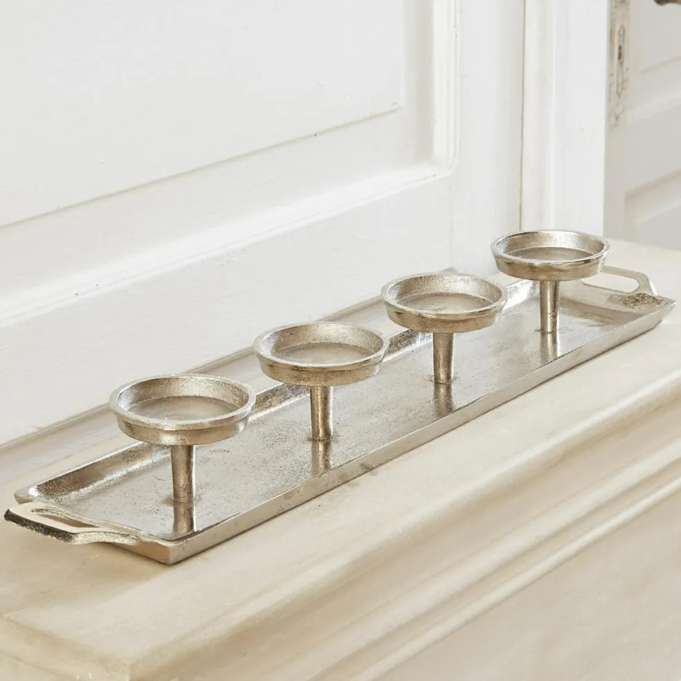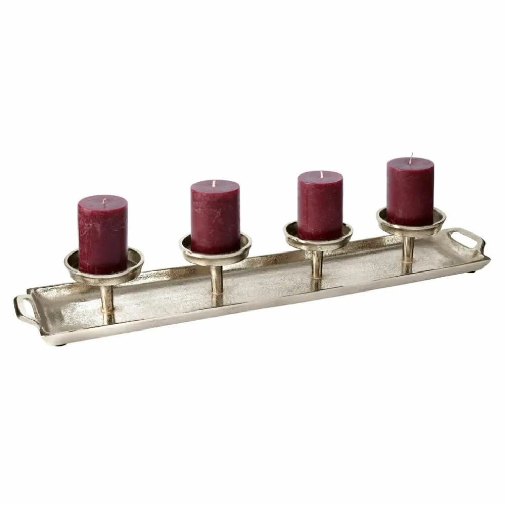Ganz egal, ob Sie dieses wunderschöne Kerzentablett auf dem Esstisch, einer Kommode oder auf dem Fenstersims anrichten – es sorgt garantiert für eine wohlige Stimmung. Vier großzügig dimensionierte Kerzenteller sind darauf angebracht, sodass nicht nur Teelichter, sondern auch große Stumpenkerzen darauf Platz finden. Das zeitlose Design überzeugt mit einem silbrigen Schimmer, der die elegante Note des Kerzentabletts unterstreicht. Es passt es zu fast allen Einrichtungsstilen und kann auch mit Accessoires in kräftigen Farben kombiniert werden. Dieses einzigartige Design vereint auf elegante Art und Weise ein praktisches Tablett mit einem hübschen Kerzenhalter. So kann auf dem Tablett zusätzlich noch allerhand Deko hübsch arrangiert werden – je nach Jahreszeit.