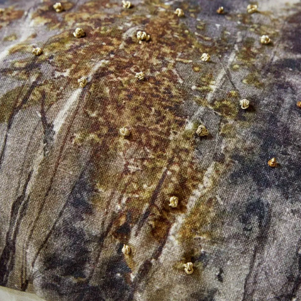 Diese exquisit gefertigte Kissenhülle ist eine wahre Augenweide, die natürliche Eleganz in jedes Zuhause bringt. Bedruckt mit einem beruhigenden Waldmotiv, bietet die Hülle eine perfekte Mischung aus Kunst und Natur. Die feinen Details der kleinen goldenen Pailletten und die einzigartigen, handbestickten „Knötchen“ erwecken das Waldmotiv zum Leben und verleihen ihm einen subtilen Glanz, der das Auge fesselt. Der weiche Baumwollstoff bietet nicht nur optischen Genuss, sondern auch ein angenehmes Gefühl bei jeder Berührung.