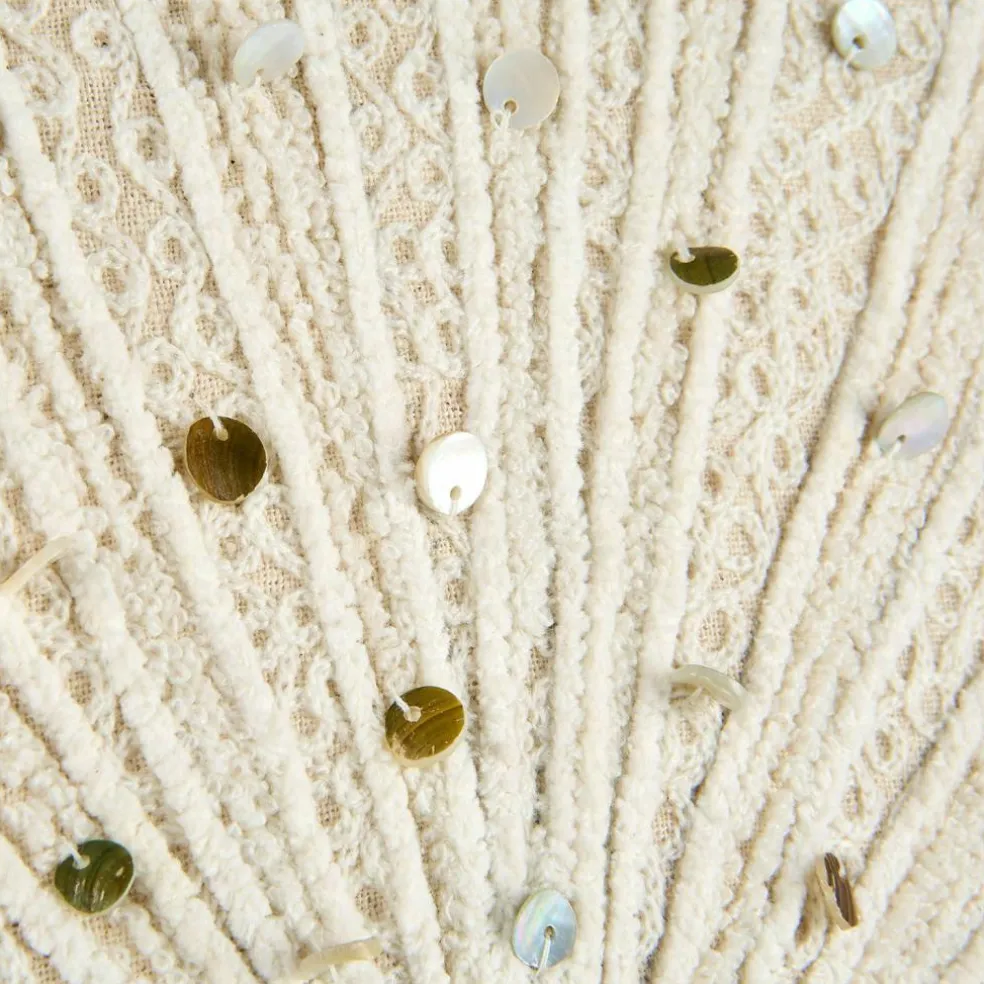 Ein außergewöhnliches Accessoire für Ihr Zuhause: Diese Kissenhülle vereint maritimes Design mit kunstvoller Verarbeitung. Das handbestickte Muschel-Motiv erinnert an sommerliche Tage am Meer und wird durch zarte Perlmutt-Pailletten zum Funkeln gebracht. Die gewebte Textur verleiht der Hülle eine natürliche, warme Ausstrahlung, während die aufwendige Gestaltung jedes Detail zum Blickfang macht. Perfekt, um Ihrem Wohn- oder Schlafzimmer einen Hauch von Küstenromantik zu verleihen. Mit ihrer harmonischen Farbgebung fügt sich die Kissenhülle ideal in unterschiedlichste Einrichtungsstile ein und setzt gleichzeitig einen individuellen Akzent.