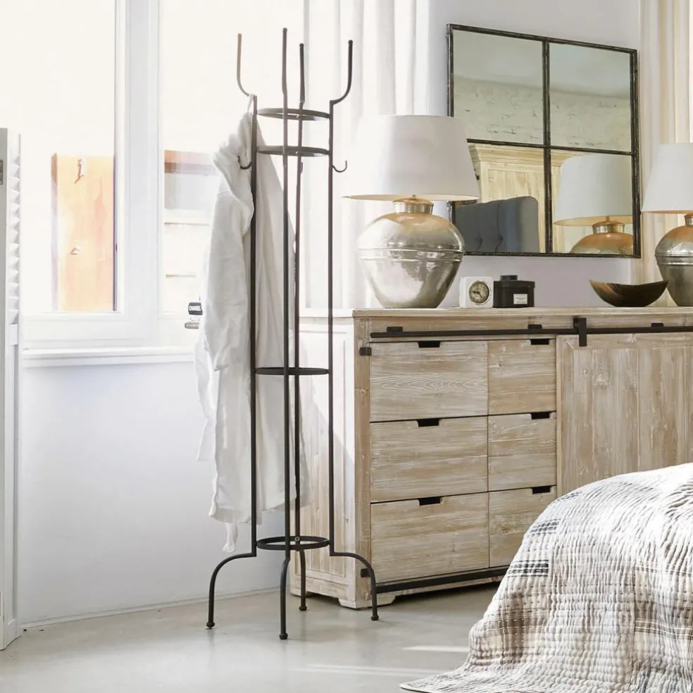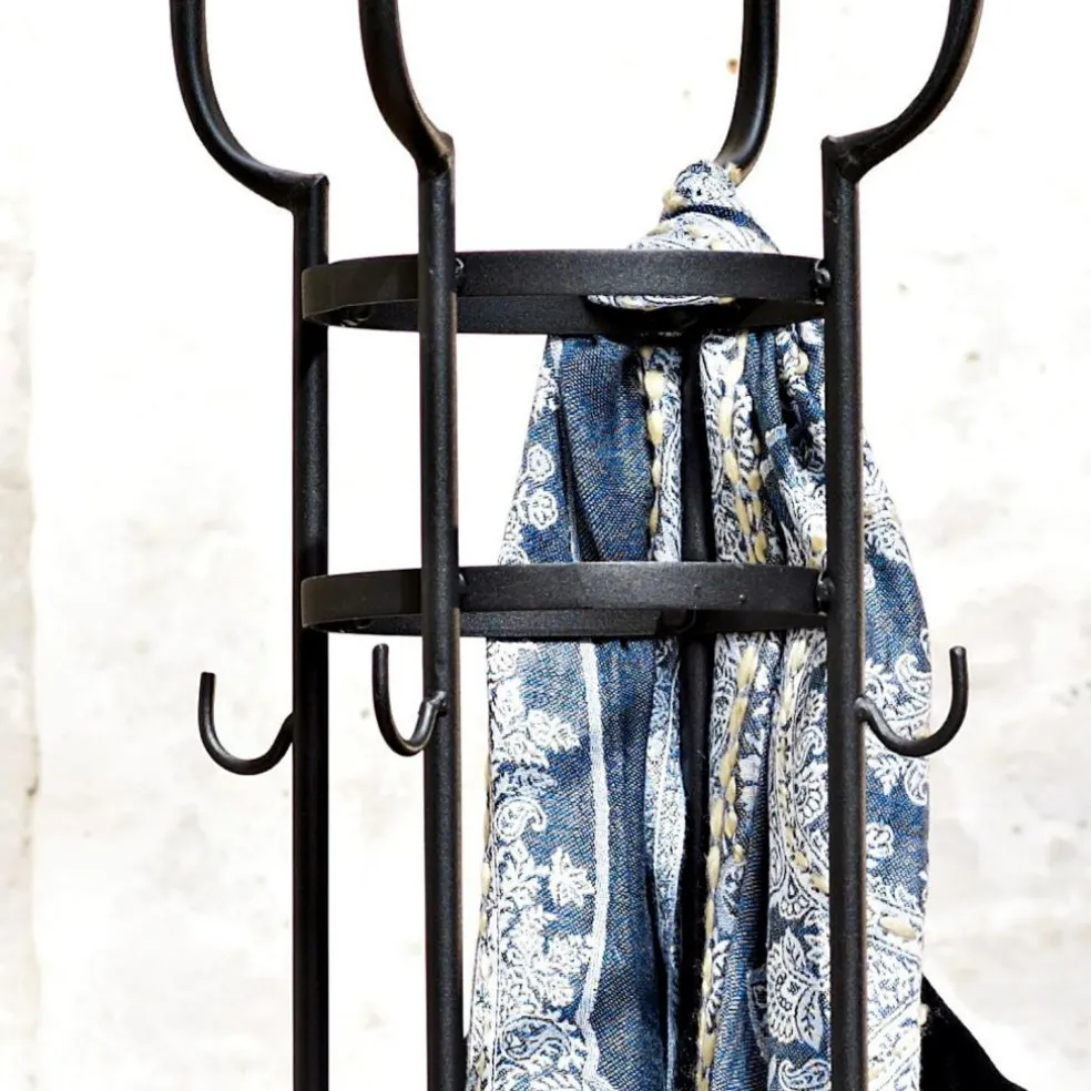 Der schlanke Garderobenständer steht für Understatement pur und überzeugt im klassischen Art-Déco-Stil. Das dunkel lackierte Eisen und die schlichte, schmale Form machen den Ständer zu einem alltagstauglichen und zeitlosen Accessoire. Die vier zierlich anmutenden Füße sorgen für einen sicheren Stand – oben bieten praktische Haken rundum ausreichend Platz für jede Menge Jacken und Mäntel.