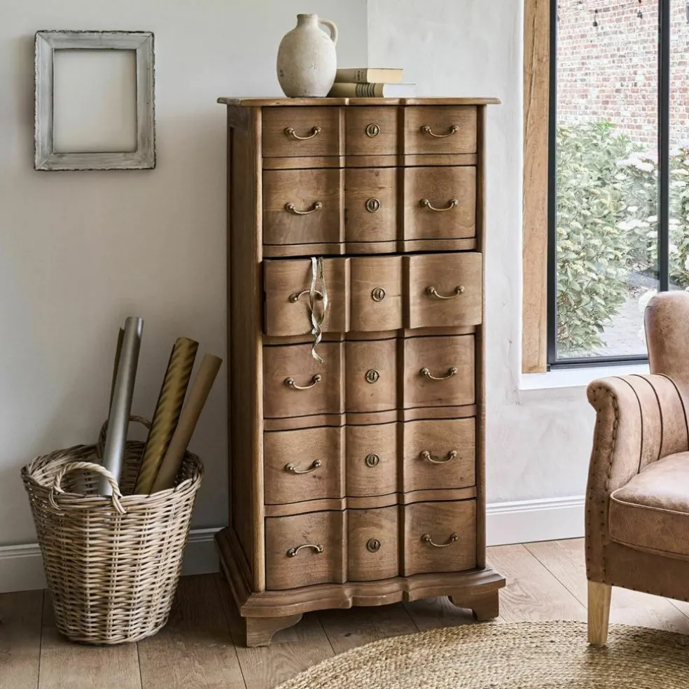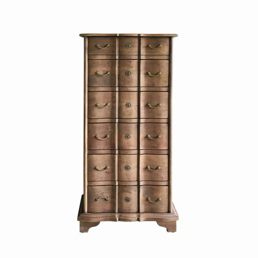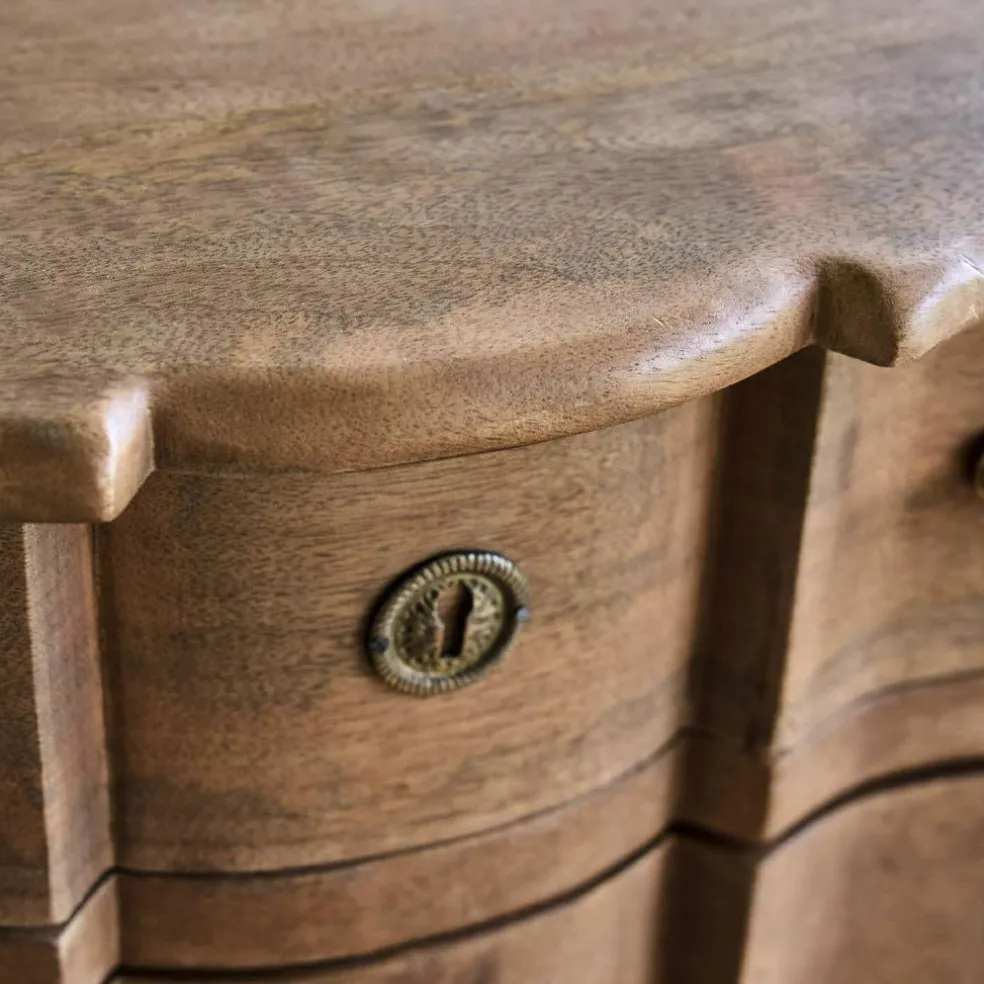 Wer den Charme vergangener Zeiten schätzt, wird sich in dieses Möbelstück verlieben. Gefertigt aus massivem Mangoholz, bringt die Kommode mit ihrem sanften Antik-Finish Wärme und Charakter in den Raum. Besonders ins Auge fällt die sanft geschwungene Front, die dem Stück eine fast skulpturale Wirkung verleiht. Feine Details wie die kunstvoll geformten Metallgriffe und die zierlich patinierten Schlüsselschilder erinnern an historische Handwerkskunst und verleihen jeder Schublade eine eigene Persönlichkeit. Ob im Schlafzimmer, Flur oder als stilvoller Akzent im Wohnzimmer – diese Kommode begeistert mit Ausstrahlung und Stauraum gleichermaßen.