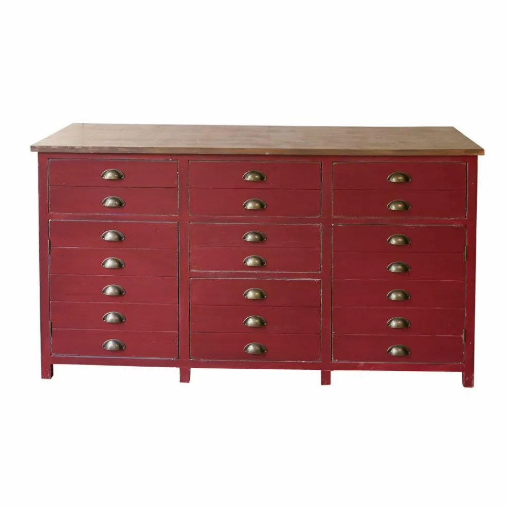 Nicht immer sind die Dinge so, wie sie auf den ersten Blick erscheinen. Dieser philosophisch anmutende Satz lässt sich perfekt auf diese Kommode anwenden. Denn nicht jede der Schubladen, die Sie an dieser Kommode sehen, ist auch eine. Die unteren drei Schubladen auf der rechten und linken Seite der Kommode sind in Wirklichkeit Türen, hinter denen sich jeweils drei geräumige Ablagefächer befinden. Darüber und in der Mitte warten echte Schubladen darauf, dass Sie die verschiedensten Utensilien ordentlich in ihnen verstauen. Im Speisezimmer zum Beispiel Geschirr, Tischwäsche und Co, im Schlafraum können endlich Wäsche, Strümpfe, Pullis, Tücher und vieles mehr ordentlich untergebracht werden, so dass Sie am Morgen das Gesuchte mit einem Handgriff finden. Und im Eingangsbereich warten Schuhe und Taschen, Mützen und Handschuhe der ganzen Familie auf ihren nächsten Einsatz. Aber auch rein optisch hat die Kommode mehr zu bieten als ein x-beliebiger Ordnungshelfer. Von der sorgfältigen Schreinerarbeit über die stiltypischen Muschelgriffe aus Eisen bis zu dem antikroten Farbton kann die Kommode stolz alle Attribute vorzeigen, die den klassischen Landhaus-Look ausmachen. Einschließlich der liebenswerten Shabby-Spuren, die ihr eine individuelle Note geben.