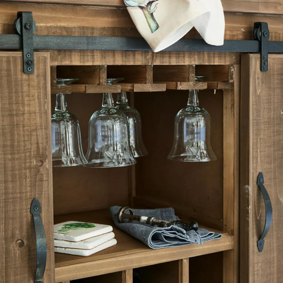 Den Charme eines mediterranen Landhauses verbreitet dieses imposante Möbelstück. Ansprechendes und durchdachtes Design machen es zu einem wundervollen Objekt – und das nicht nur für Weinkenner. Dennoch eignet es sich für alle, die gerne einen edlen Tropfen im Hause beherbergen, ganz besonders. Denn ganze acht Fächer für Flaschen befinden sich in der Mitte des Schranks. In der Halterung über dem Flaschenregal können Wein- oder Sektgläser aufgehängt werden. Hinter den Schiebetüren links und rechts ist weiterer Stauraum. Jeweils ein fester Einlegeboden teilt diesen. Somit stehen vier Fächer zur Verfügung, zum Beispiel für Geschirr oder Bücher. Front und Rahmens sind aus hochwertigem Holz gefertigt. Die Griffe, Scharniere und die Führungsschiene für die Schiebetüren sind aus Eisen. Das Zusammenspiel der Materialien unterstreicht die rustikale Note. In einer großen Wohnküche oder im Esszimmer zieht dieses Piece alle Blicke auf sich.