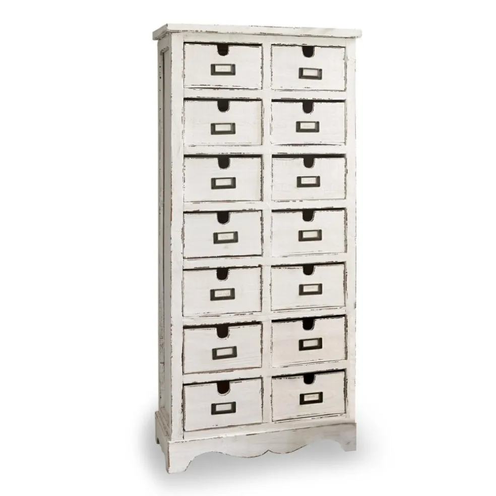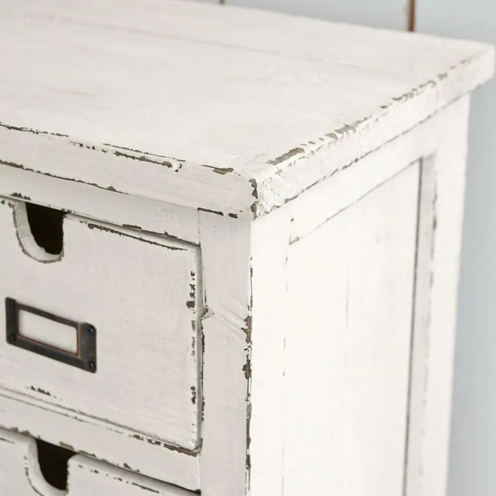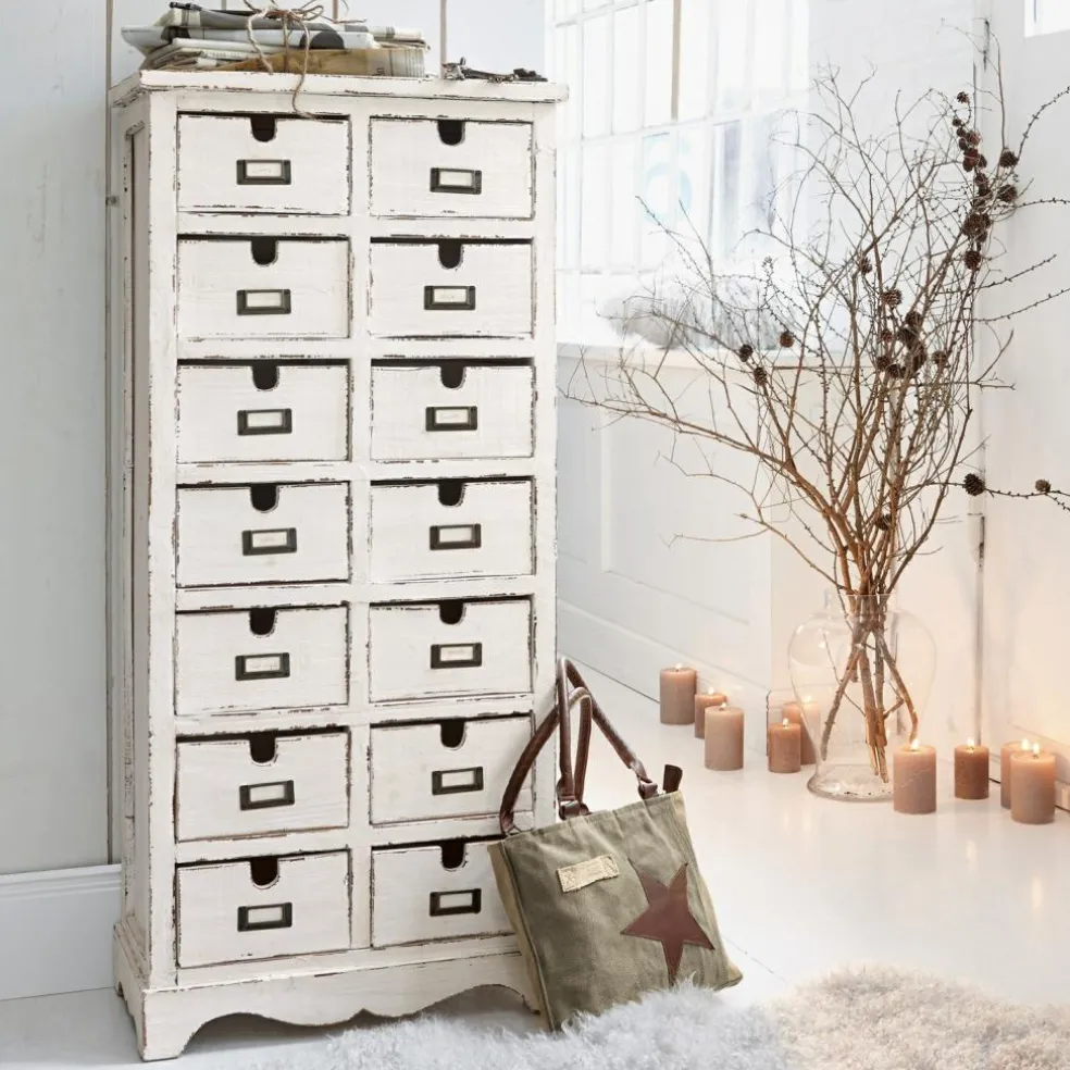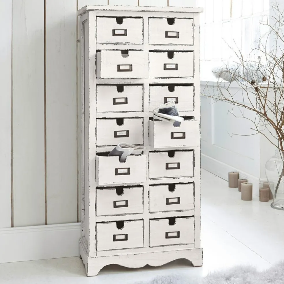 Das Prädikat „Shabby Chic in Perfektion“ ist hier definitiv keine Übertreibung. Die außergewöhnliche Kommode wird komplett aus massivem Tannenholz gezimmert und in einem aufwendigen, mehrstufigen Prozess lackiert und veredelt. Das Ergebnis ist ein bezaubernder Look, der den Eindruck eines über Jahrzehnte gealterten Originals vermittelt. Die Seitenteile erfreuen das Auge mit einer hübschen Kassettenoptik, charmante Griffmulden und kunstvoll geschwungene Fußteile runden das Design ästhetisch ab. Gleich 14 Schubfächer stehen zur Verfügung und die darauf angebrachten Schildchenhalter kontrastieren ganz wunderbar mit dem hellen Anstrich.
