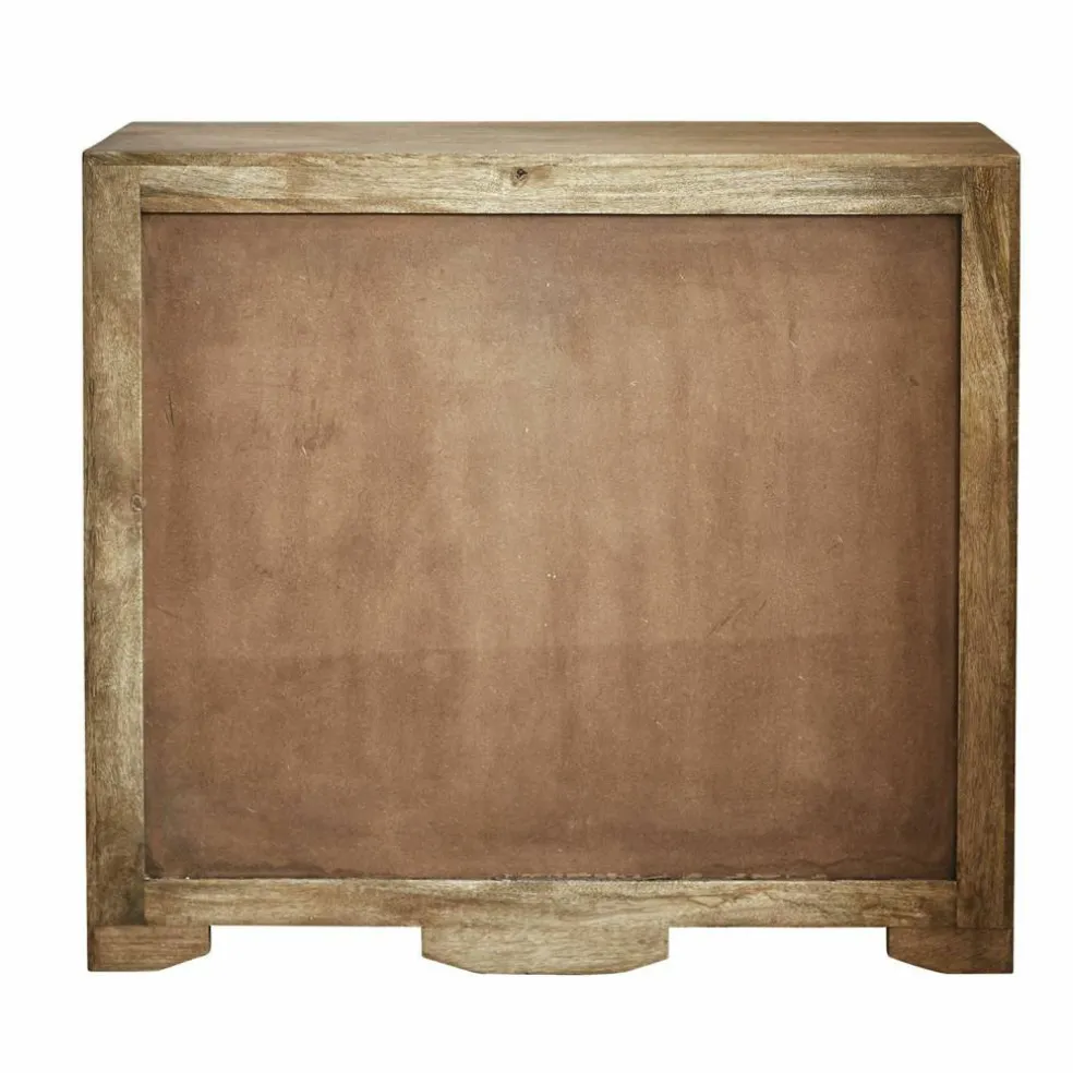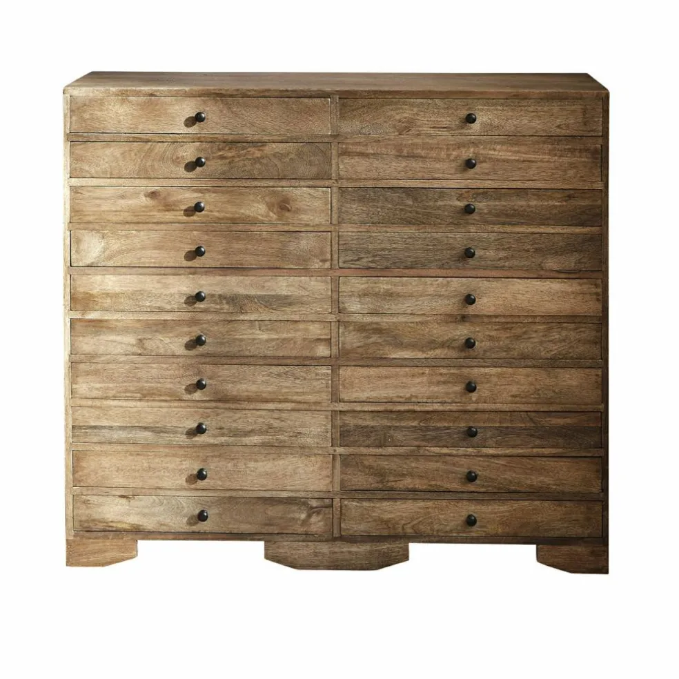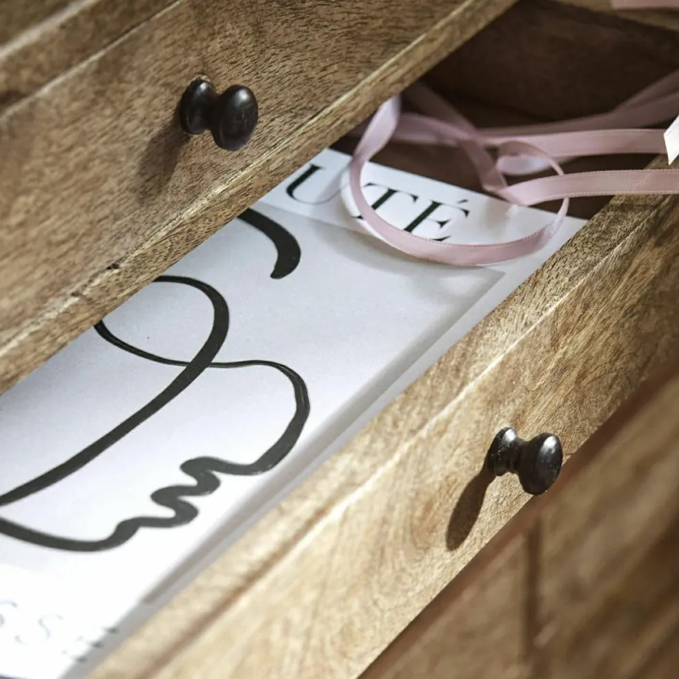 Diese klassische und edle Kommode besteht aus wertvollem Mangoholz, die dekorativen Griffe sind aus Eisen. Da das Holz stilvoll und passend im Finish eingefärbt ist, wird die hübsche, natürliche Holzmaserung zusätzlich betont. Zahlreiche Fächer bieten viel Stauraum für Papiere, Strümpfe, Spielsachen, Beauty-Artikel und mehr. So schaffen Sie ganz leicht Ordnung, und die zeitlose und hochwertige Kommode schmeichelt zusätzlich optisch vielen Interieurs. Sie passt gut zum Landhaus-Stil und macht in wirklich jedem Raum eine gute Figur, ob Flur, Wohn- oder Schlafzimmer – ein Gewinn für viele Jahre mit natürlichem Charme. Obenauf lassen sich zum Beispiel dekorativ eine kleine Lampe, Blumen oder Bücher platzieren.