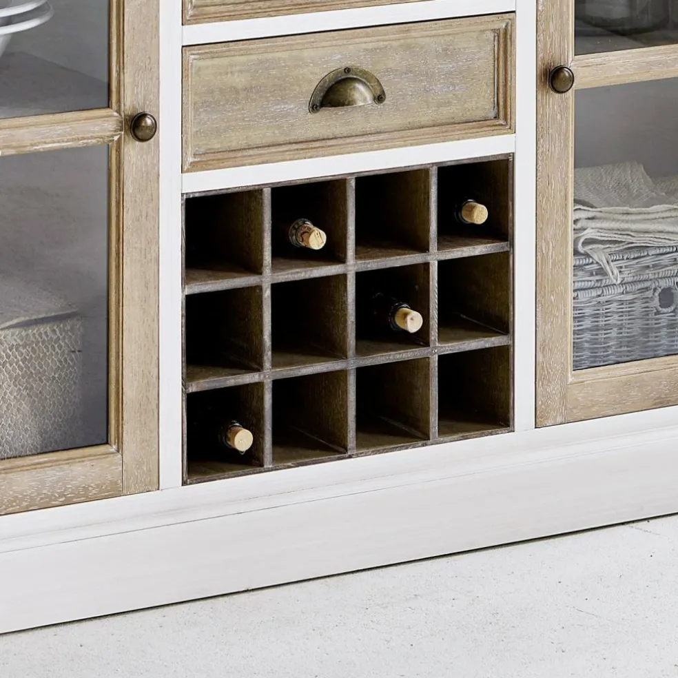 Die gelungene Symbiose aus zwei verschiedenen Farben macht die Kommode zu einem attraktiven Möbel im klassischen Landhaus-Stil. Das Regal bietet ausreichend Platz für Ihre Lieblingsweine. In den Weinfächern – im Mittelteil der Kommode – haben davon bis zu 12 Flaschen Platz. Passend dazu können Sie Ihre Weingläser in den beiden Seitenteilen unterbringen. Noch mehr Stauraum bieten die drei Einschübe, die mit hübschen Metallgriffen im Nostalgie-Look verziert sind. Jeweils zwei Türen mit einem eleganten Sprossenfenster ergänzen das großzügige Platzangebot. Auffallend hübsch ist der Farbkontrast zwischen dem dunklen und dem weiß gekälktem Kiefernholz. Auch im Innenraum wird das Farbkonzept wieder aufgegriffen: Alles erstrahlt in einem Antikweiß.