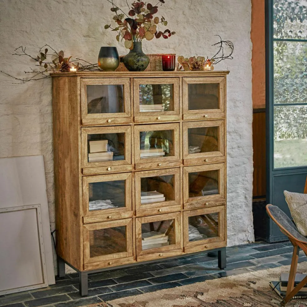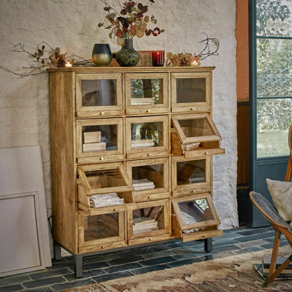 Dass unterschiedliche Materialien einen ganz besonderen Reiz ausüben können, beweist diese Kommode aufs Schönste. Hochwertiges Mangoholz mit charaktervoller Maserung in Antikbraun bildet den massiven Rahmen für die zwölf dekorativen Fächer, die mit Glaseinsätzen versehen sind. Beim Herausziehen der geräumigen Schubladen im Inneren öffnen sich die Türen elegant nach oben – ein wundervoller Hingucker. Vollendet wird das Möbel durch ein Fußgestell aus Eisen, das für stabilen Stand sorgt. Ein Schmuckstück, das Stil und Funktion perfekt vereint – und sich in der Diele genauso wohl fühlt, wie im Schlafzimmer oder Arbeitszimmer. Das Highboard bietet Platz für Tisch- und Bettwäsche, für Mode-Accessoires oder stellt hübsche Dekoartikel zur Schau. Perfekt für Einrichtungen im Industrial-Style, Landhaus- oder Vintage-Chic.