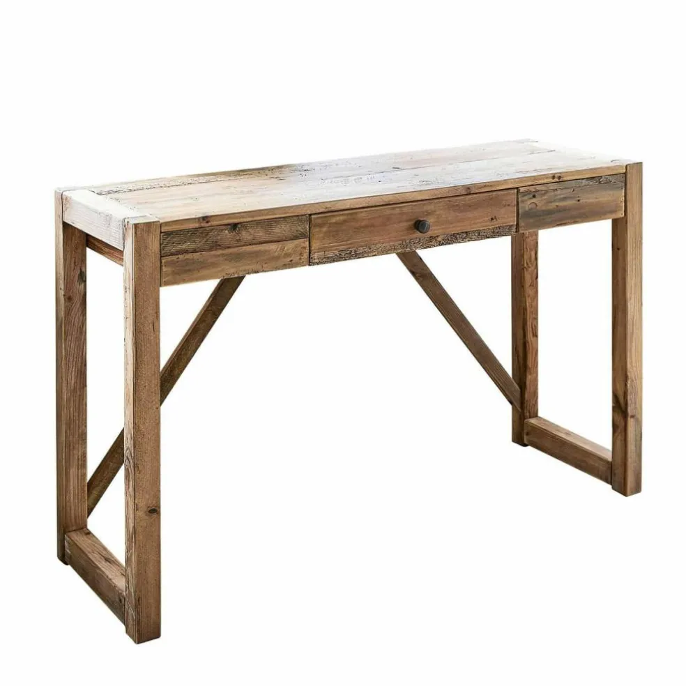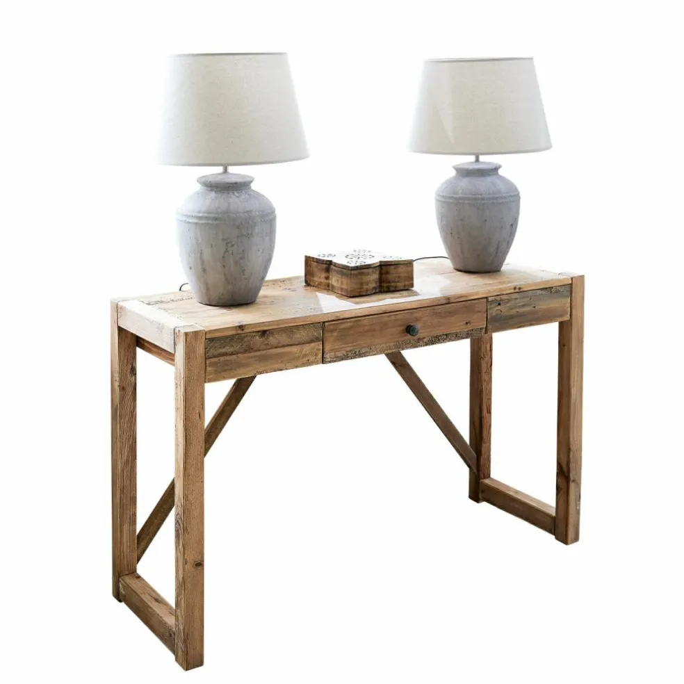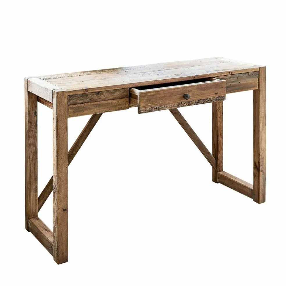 Diese Konsole könnte ein neues Lieblingsstück in Ihrem Zuhause werden. Kein Wunder, das Design bewegt sich zwischen klassischer Eleganz und ländlichem Charme und die Qualität ist nachhaltig schön. Dafür wurde massives Kiefernholz sorgfältig wiederaufbereitet – so kommt die charakteristische Struktur des Naturmaterials erneut effektvoll zum Vorschein. Auch die Spuren des Alters bleiben bewusst bewahrt und machen so das Möbelstück noch reizvoller. Praktischen Mehrwert erhält die Konsole durch die mittig integrierte Schublade. Ein stilvoller Solitär, der jedes Interieur bereichert. Die schlichte, geradlinige Gestaltung verleiht dem Möbel eine optische Leichtigkeit, die sich in viele Raumsituationen mühelos einfügt – ob im Entree, im Wohnbereich oder Schlafzimmer.