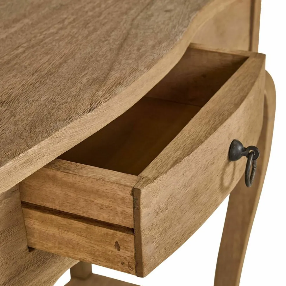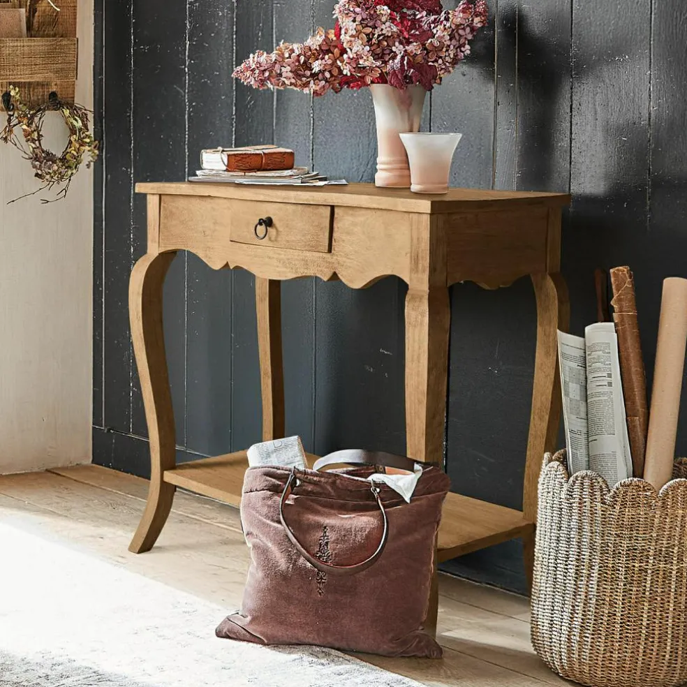 Diese Konsole ist eine Hommage an die Ästhetik vergangener Zeiten. Die sanft geschwungenen Beine und die feinen Details der Blende verleihen ihr einen Hauch von französischem Landhausstil. Die warme Holzstruktur mit sichtbarer Maserung sorgt für eine natürliche und einladende Optik. Eine praktische Schublade mit filigranem Metallgriff bietet Platz für Schlüssel, Notizen oder andere Kleinigkeiten, während die untere Ablage für zusätzlichen Stauraum sorgt. Ob als charmantes Möbelstück im Flur, als dekorativer Blickfang im Wohnbereich oder als stilvolle Ergänzung im Schlafzimmer – diese Konsole verbindet Funktionalität mit zeitloser Schönheit.