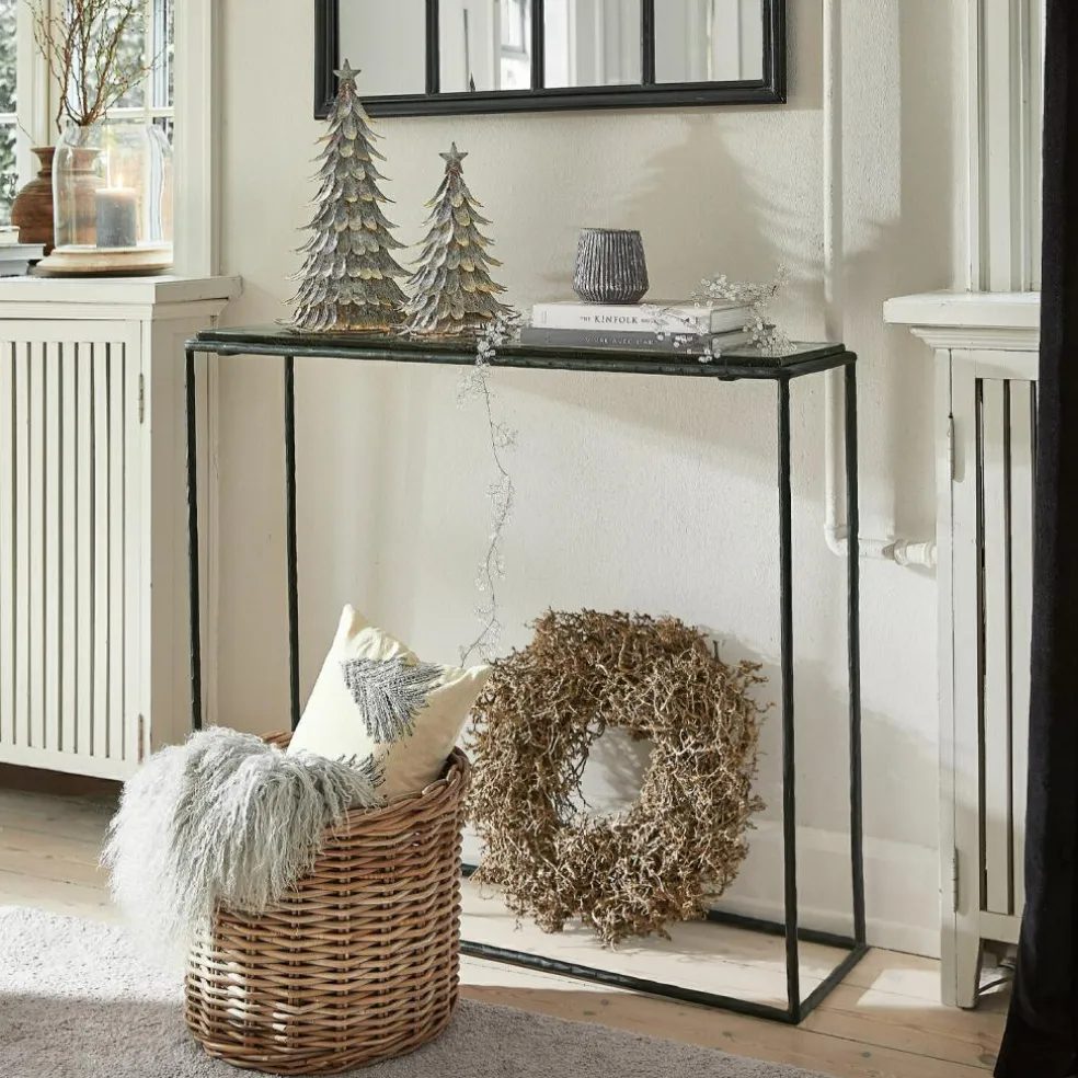 Dieser Konsolentisch besticht durch seine klare, schlichte Eleganz und hochwertige Materialien. Die dicke Glasplatte sorgt für eine luftige, transparente Optik, die jeden Raum aufhellt und gleichzeitig Stabilität vermittelt. Das filigrane Gestell aus pulverbeschichtetem Eisen bietet nicht nur robusten Halt, sondern verleiht dem Tisch auch einen modernen, industriellen Touch. Ob im Eingangsbereich, im Wohnzimmer oder als stilvolle Ablage im Schlafzimmer – dieser Tisch ist ein vielseitiger Begleiter, der Funktionalität mit ästhetischem Anspruch verbindet. Er ist perfekt, um dekorative Accessoires, Vasen oder Ihre Lieblingsbücher stilvoll zu präsentieren.