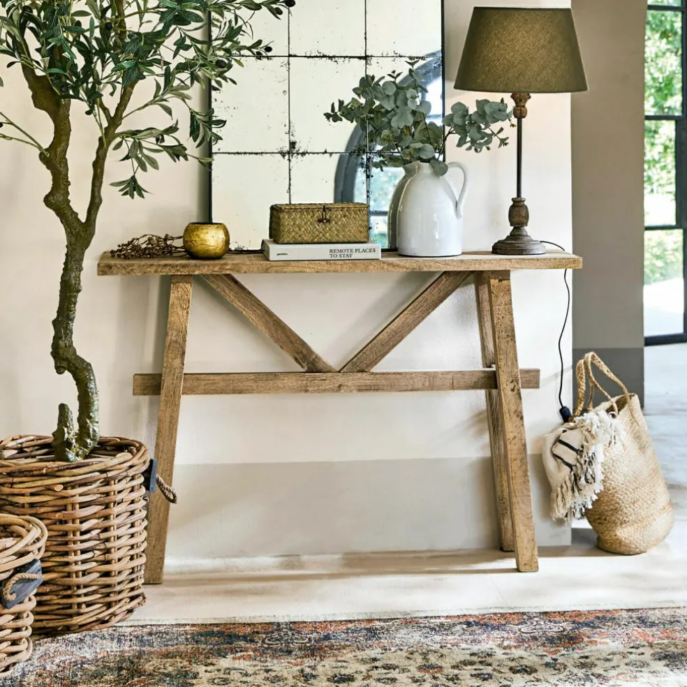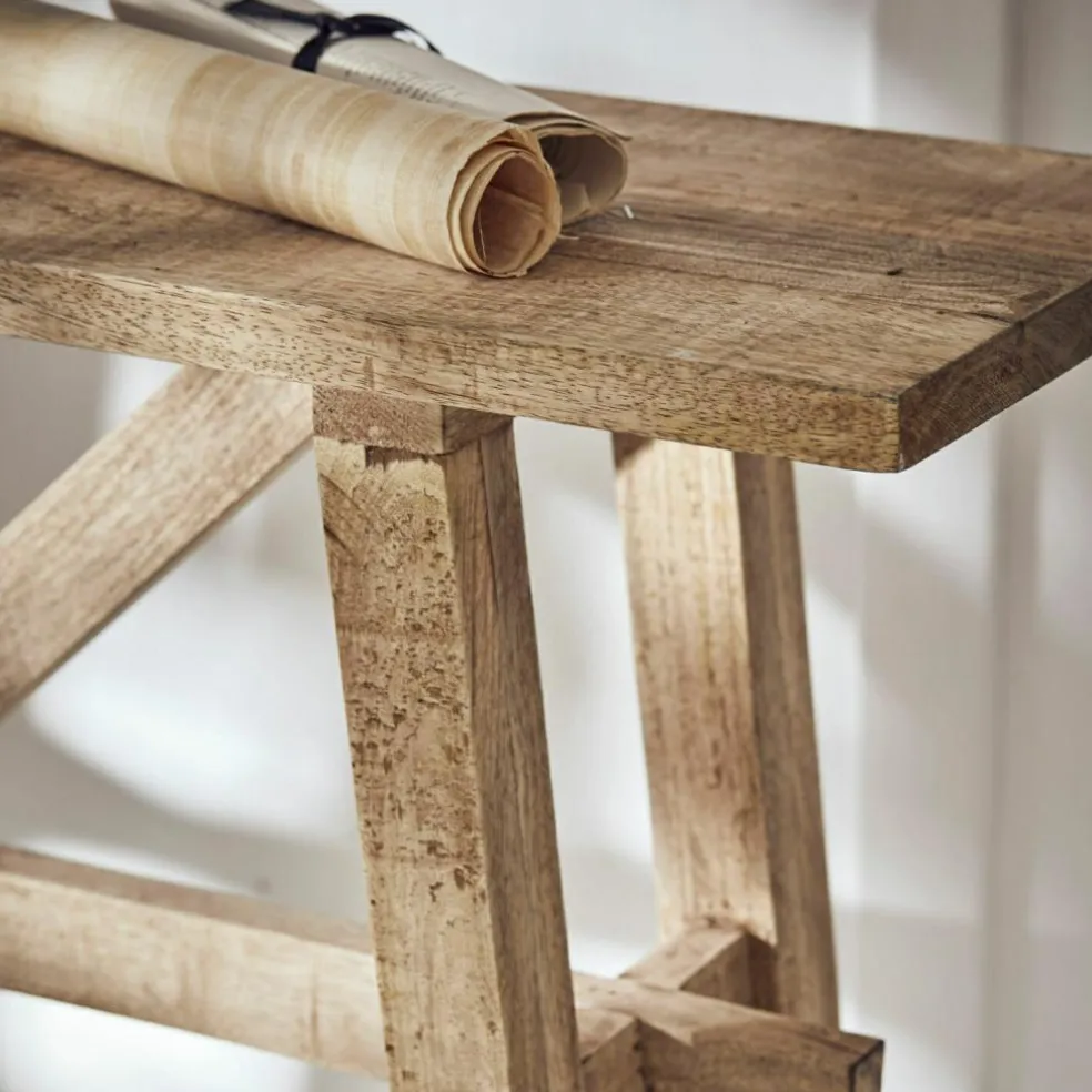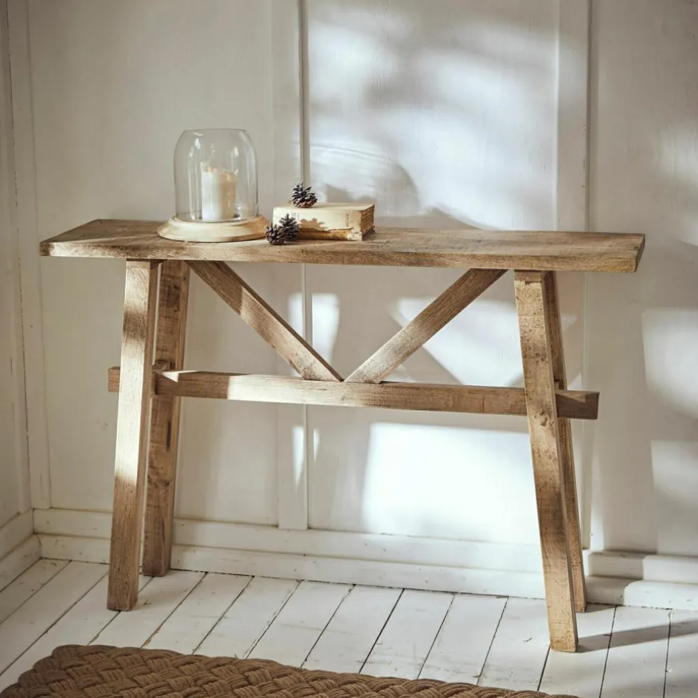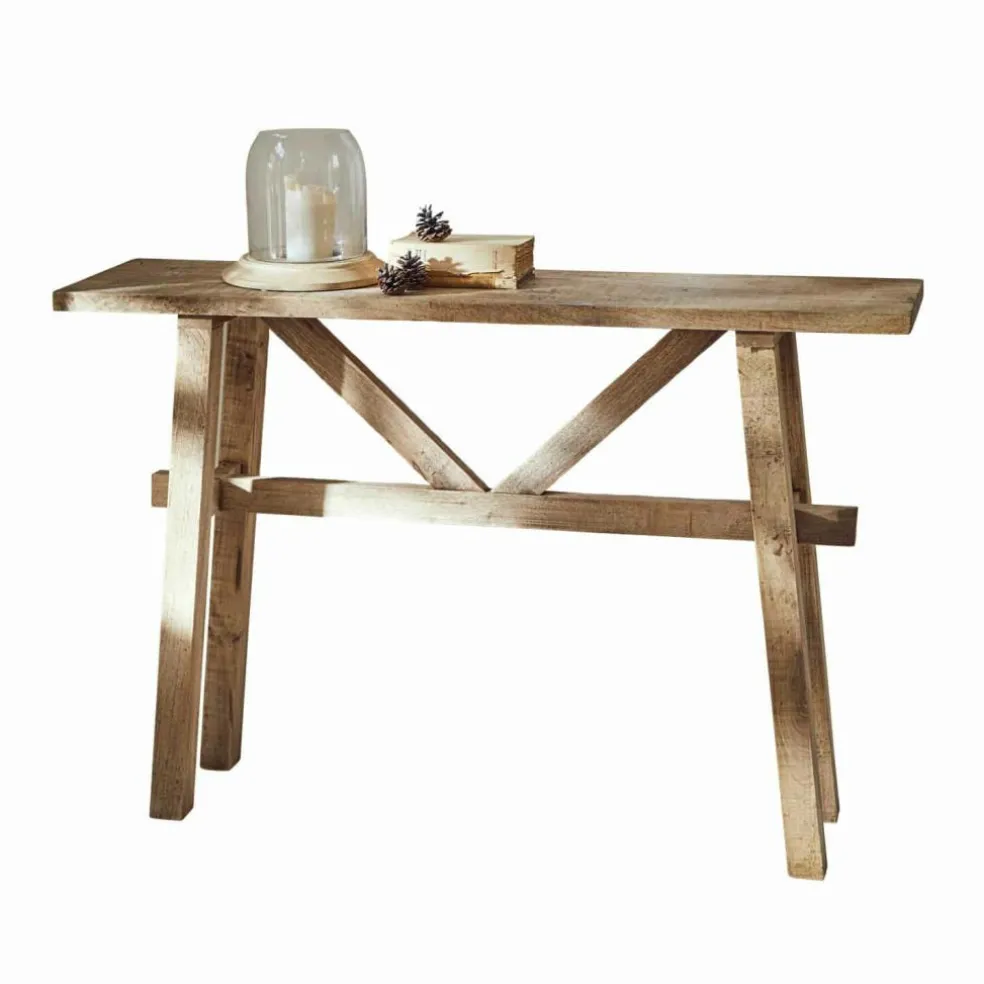 Sie sind nur so schmal wie ein Regal, aber so hoch wie ein Tisch – kein Wunder, dass sich Konsolen über die Jahrhunderte einen festen Platz in den Wohn-Interieurs erobert haben. Die ersten Konsolentische, wie diese Möbel im 17. Jahrhundert noch hießen, hatten übrigens tatsächlich nur zwei Beine und mussten an der Wand befestigt werden. Über diese Frühform ist unsere Konsole aber selbstverständlich herausgewachsen, sodass sie noch flexibler ist, was ihre Platzierung und ihre Einsatzmöglichkeiten betrifft. Und die sind schier unendlich. So kann die Konsole in einem beengten Eingangsbereich als platzsparende Ablage für Portemonnaie und Handy dienen, mit einem passenden Spiegel oder einer Wandgarderobe darüber. Sie kann aber auch im Wohn- oder Essbereich die stilvolle Basis für Ihre individuellen Deko-Arrangements bilden, mit der Sie die Jahreszeiten stimmungsvoll inszenieren. Oder suchen Sie eine kleine, aber originelle Lösung für die Mini-Hausbar, einen schlanken Schminktisch fürs Schlafzimmer oder vielleicht eine schlanke Anrichte für die Küche? In diesen – und noch vielen anderen Situationen – wird sich die Konsole von ihrer besten Seite zeigen. Sie besteht aus massivem Mangoholz, das durch das authentische Antik-Finish noch besser zur rustikalen Machart der Konsole passt.