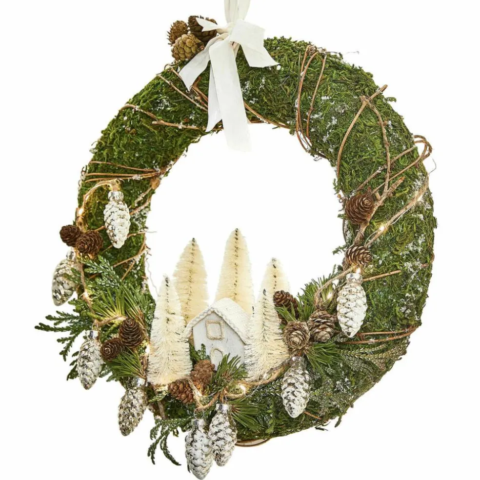 Ein perfektes Dekoschmuckstück für Ihre festlichen Tage: Der schicke Kranz ist bereit, Ihre Räume mit einer weihnachtlichen Atmosphäre zu erfüllen. Schmücken Sie mit diesem wirkungsvollen Accessoire Ihren Eingangsbereich oder zieren Sie innenliegende Wände damit. Da der Kranz mit Moos und Rattan gefertigt ist, sieht er aus, als wäre er gerade aus dem Wald direkt in Ihr schönes Zuhause gebracht worden. Dazu passt auch die kleine Szenerie, die in den Kranz eingebettet ist: Sie zeigt ein gemütliches, kleines Haus mit Bäumchen drum herum. Lassen Sie sich von dieser idyllischen Szene und dem natürlichen Look des Schmuckstücks verführen und freuen Sie sich über diesen ganz besonderen, natürlichen Akzent an Wänden oder Türen. Bereichern Sie hiermit Ihre winterliche Deko-Welt in Ihrem Zuhause!