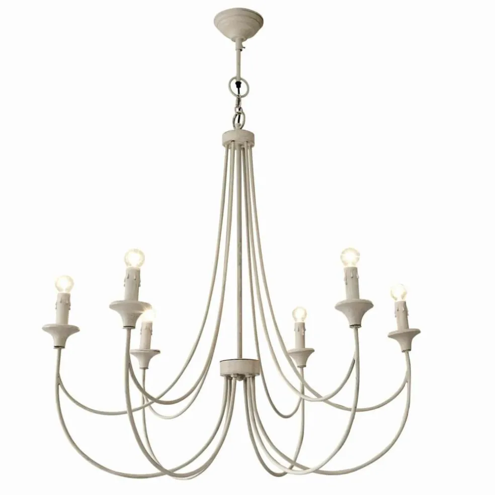 Wie ein Gemälde aus Licht spannt dieser Kronleuchter seine filigranen Bögen durch den Raum. Schlank geschwungene Eisenarme, die sich leicht und anmutig aus der Mitte entfalten, tragen jeweils kleine Fassungen – bereit, das warme Strahlen von bis zu 16 Leuchtmitteln zu empfangen. Das antikweiße Finish, kombiniert mit liebevoll eingearbeiteten Holzfassungen, verleiht dem Leuchter die Aura eines Fundstücks aus einer längst vergangenen Epoche. Er füllt große Räume mit einem sanften Schein und setzt dabei sowohl über historischen als auch über modernen Interieurs einen eleganten Akzent. Ein Leuchter, der nicht nur Licht, sondern Atmosphäre schenkt.