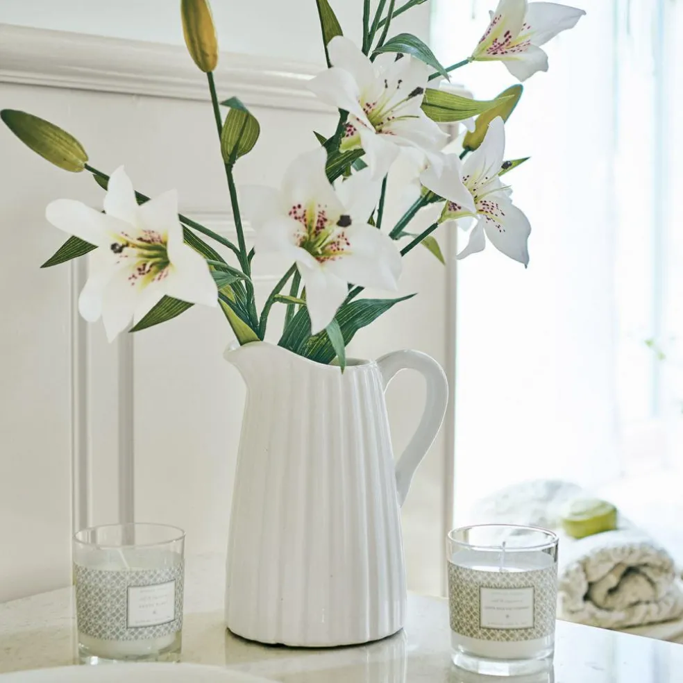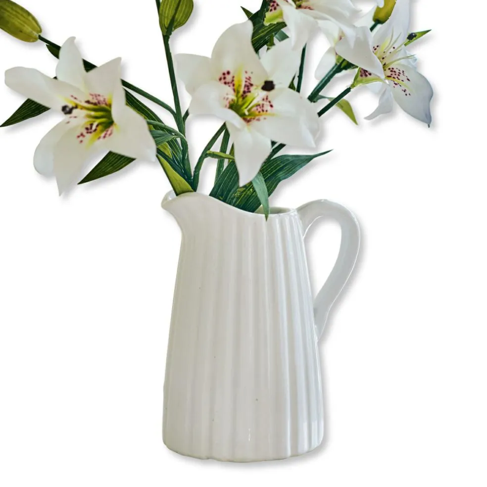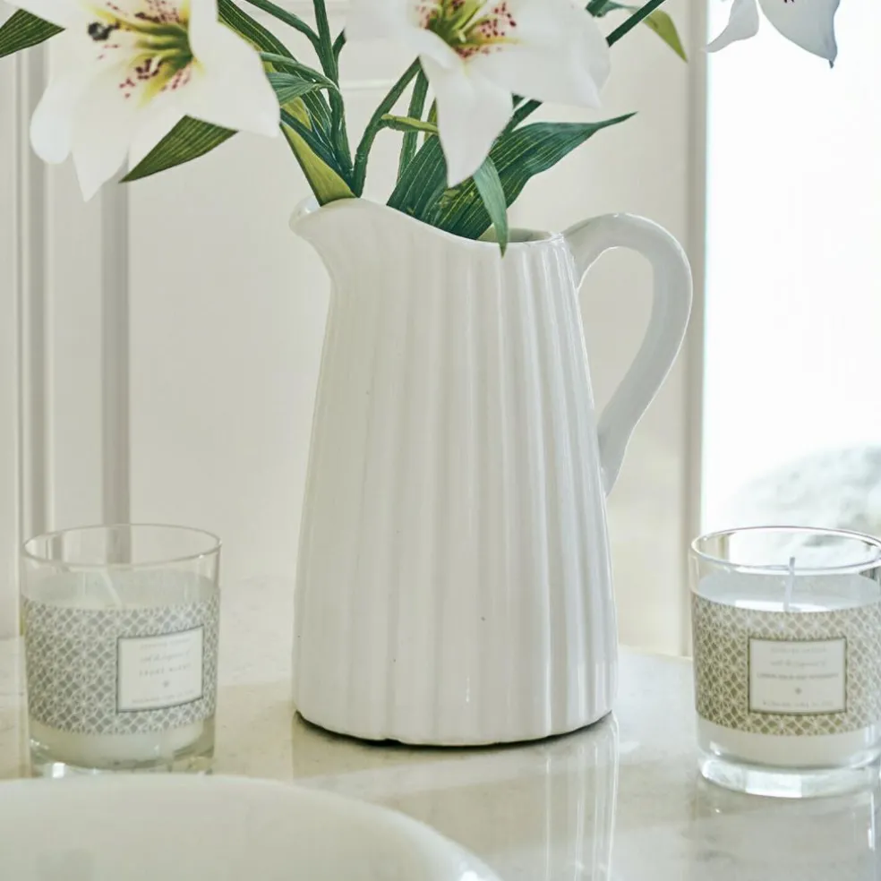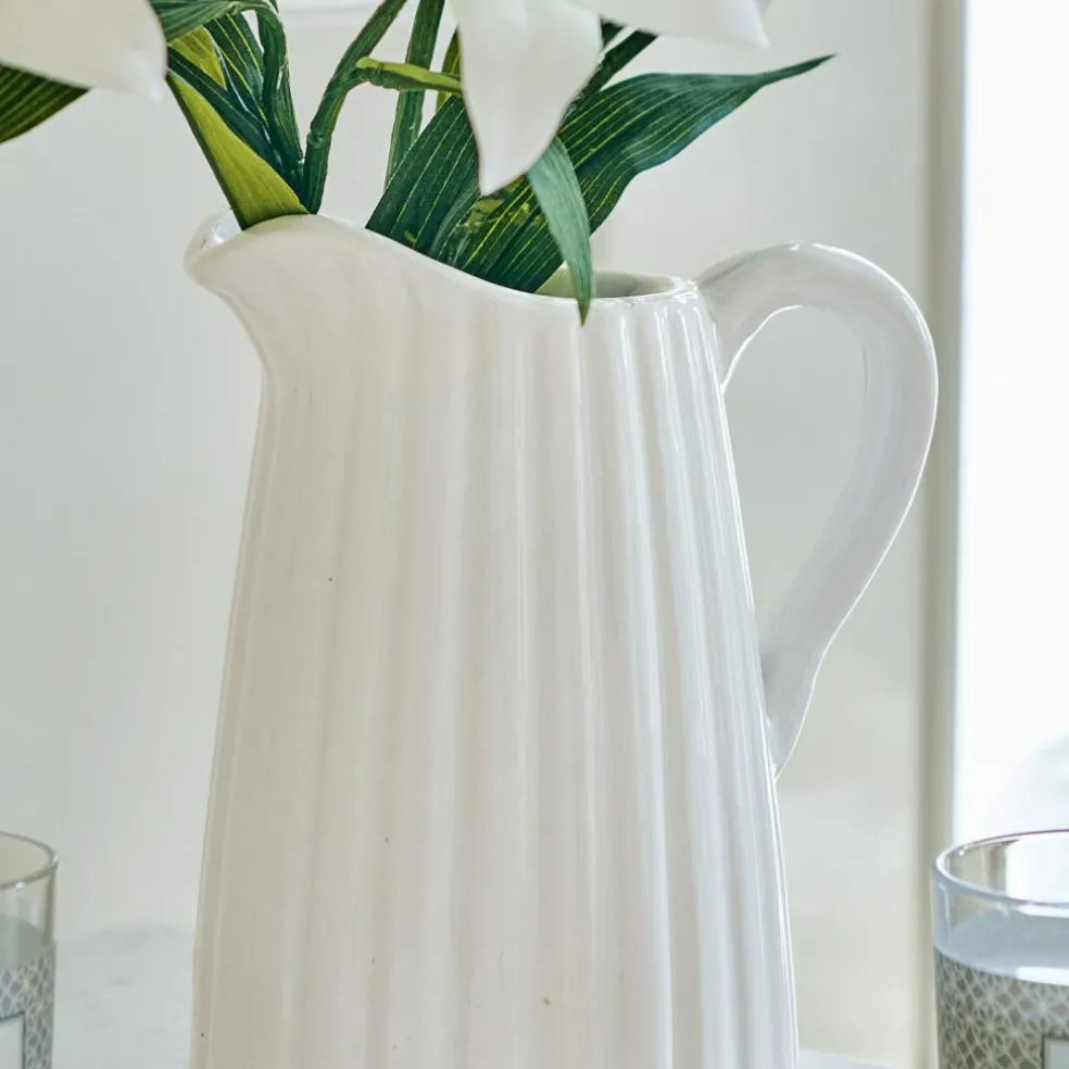 Dieser Krug ist ebenso schön wie vielseitig. Auf der Kommode im Eingangsbereich dient er als Blumenvase. In der Küche können Sie ihn neben dem Herd zur Aufbewahrung von Kochlöffeln und anderen Utensilien nutzen. Auch im Badezimmerregal ist das Schmuckstück äußerst hübsch anzusehen. Mit Wasser gefüllt, erfüllt der Krug auf dem Esstisch seinen klassischen Zweck. Kurz: Nutzen Sie ihn ganz nach Belieben. Er besteht aus hochwertigem Steingut, der weiß lackiert wurde, und punktet mit einer zeitlos eleganten Formsprache. Die gerillte Oberfläche unterstreicht den edlen Charakter des Gefäßes.