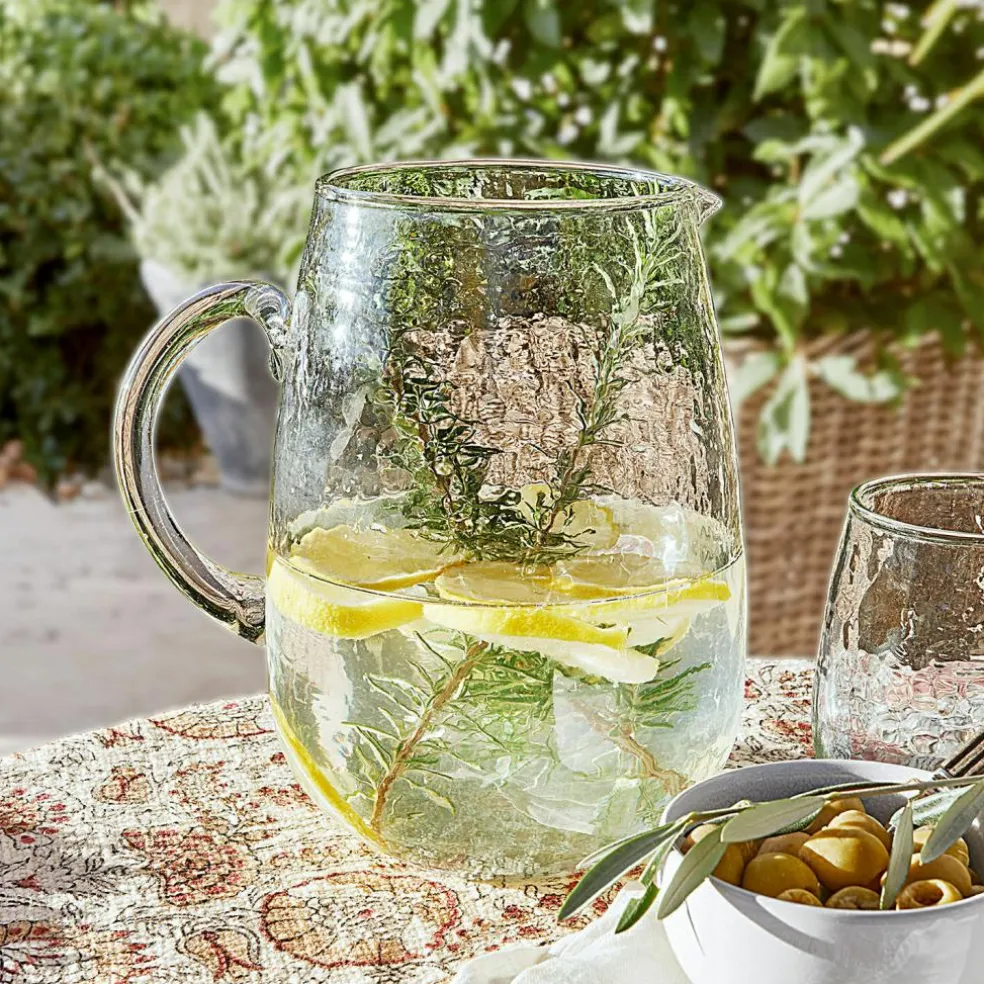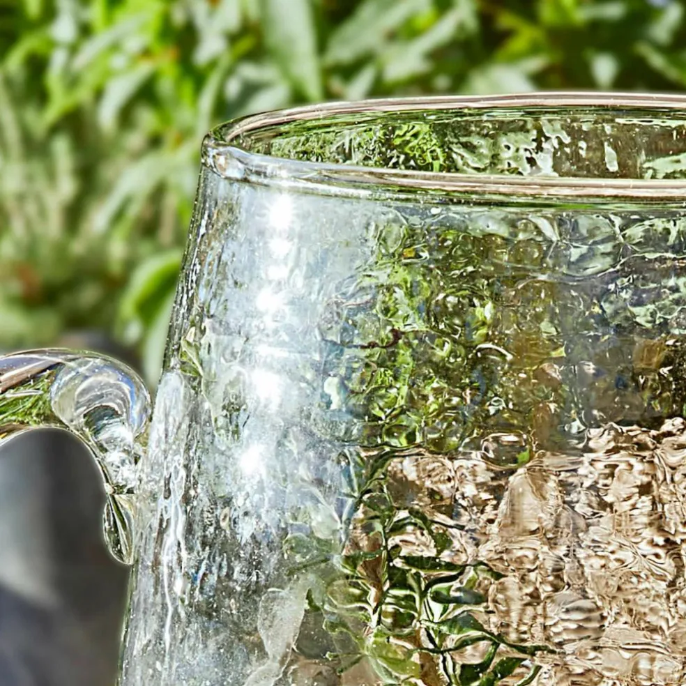 Dieser formschöne Krug besteht aus mundgeblasenem Glas mit charmanter Struktur. Die gewollten Unebenheiten geben ihm einen besonderen Charakter, und das große Füllvolumen sorgt für unbeschwerten Genuss von Wasser, Schorle oder Saft, wenn Sie zum Beispiel mit Freunden im Garten sitzen. Servieren Sie hiermit stilvoll und mit einem Hauch Nostalgie die Getränke. Auch als Vase für einen Strauß Wiesenblumen lässt der hübsche Krug sich bestens verwenden. Er ist in jeder Saison ein ansprechendes und nützliches Accessoire mit klassischem Charme.