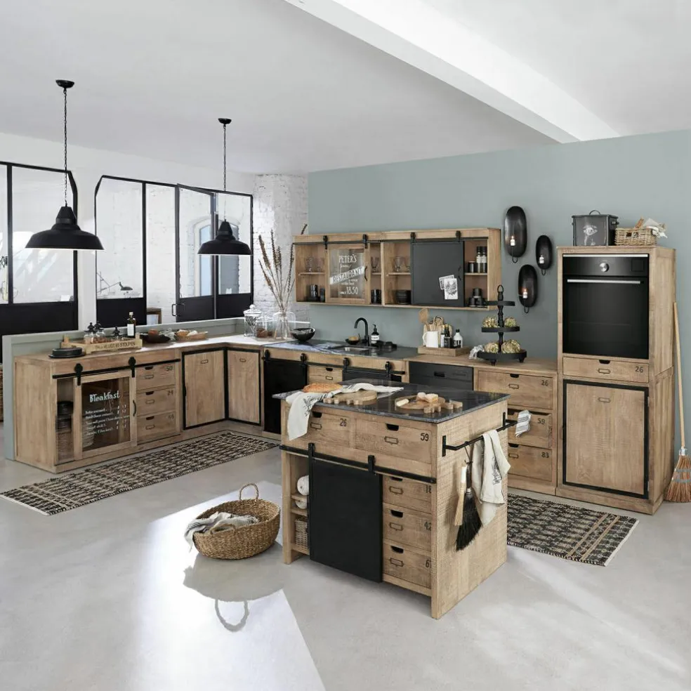 Seit einigen Jahren kombinieren ambitionierte Möbel-Designer erfolgreich zwei Stilrichtungen miteinander, die im ersten Moment nicht viel gemein haben: Landhaus und Industrial. Der eine hat eindeutig ländliche Wurzeln, während der andere ein echtes Großstadtkind ist und doch harmonieren beide wunderbar miteinander und kreieren einen neuen eigenständigen Look, der in einigen Jahren vielleicht als Landustrial Furore macht. Denn eines ist beiden gemeinsam: die Leidenschaft für rustikales Holz, ergänzt durch massives Eisen. Und die Anforderung an eine ausgezeichnete Verarbeitungsqualität, die beste Gebrauchstauglichkeit und Langlebigkeit garantiert. Deshalb besteht diese Küche aus hochwertigem, stabilem Mangoholz, das sich hier mit sägerauer Oberfläche zeigt und so noch stimmiger das dunkle Eisen ergänzt. Dank viel Stauraum, großzügigen Arbeitsflächen und Platz für moderne Haushaltshilfen herrscht in dieser Küche eine spürbar kreative, inspirierende Atmosphäre, die Sie garantiert zu exquisiten Gourmet-Kreationen anspornen wird. Kreativ dürfen Sie aber nicht nur beim Kochen werden, sondern schon beim Zusammenstellen der Küche, denn die fünf Module sind flexibel kombinierbar. Die Küche besteht aus einem Küchenblock 21165) mit Glastür und drei Schubladen, einem1 Eckschrank (21166), einem Waschtisch (21164) mit hochwertiger Steinplatte und Edelstahlbecken, einem Spülmaschinenumbau (21184) mit drei geräumigen Schubladen und einem Backofenumbau (21163) mit praktischem Stauraum darunter. Zusätzliche Hängeschränke im passenden Look sind separat erhältlich (2er Set: 21187, oder auch einzeln:21167, 21185).