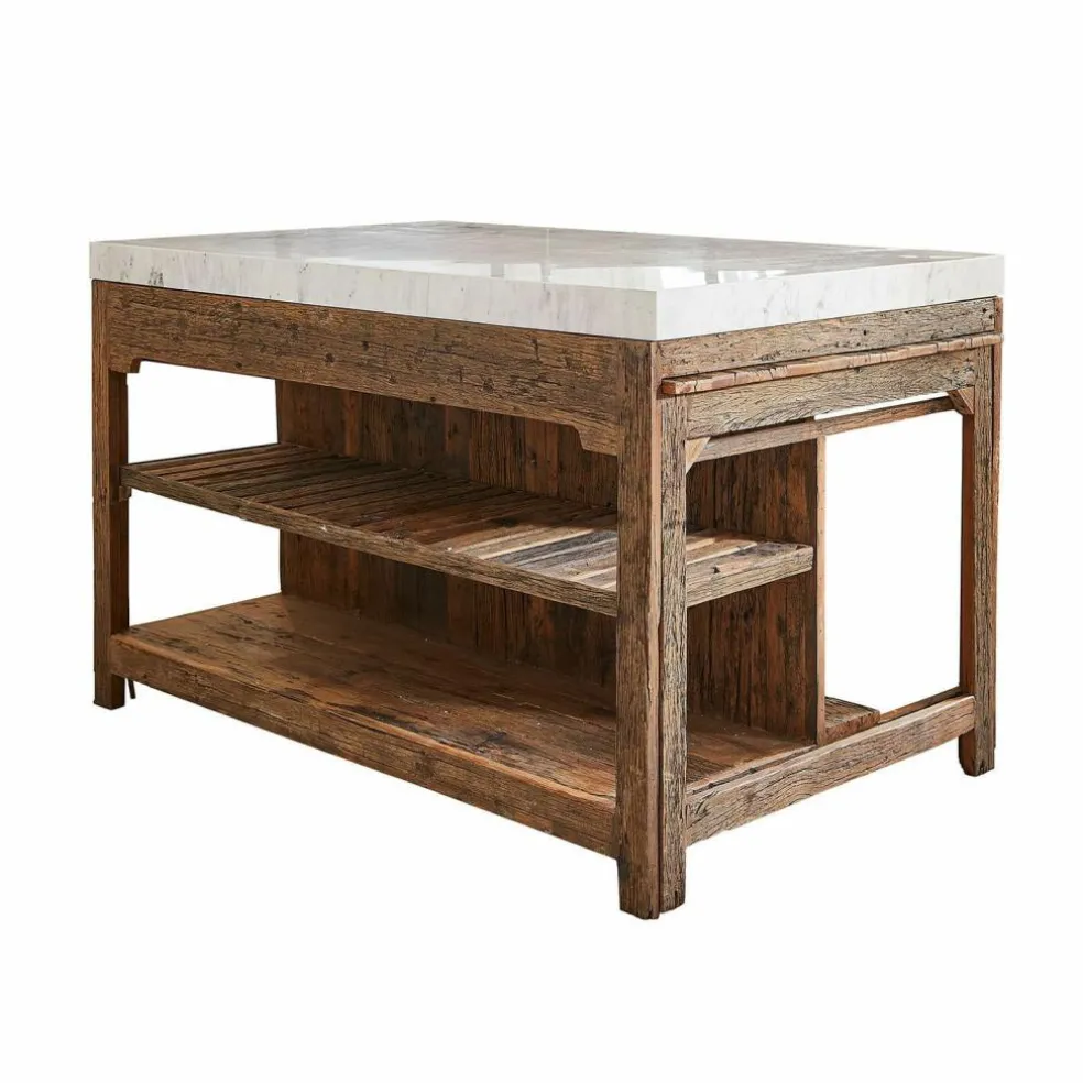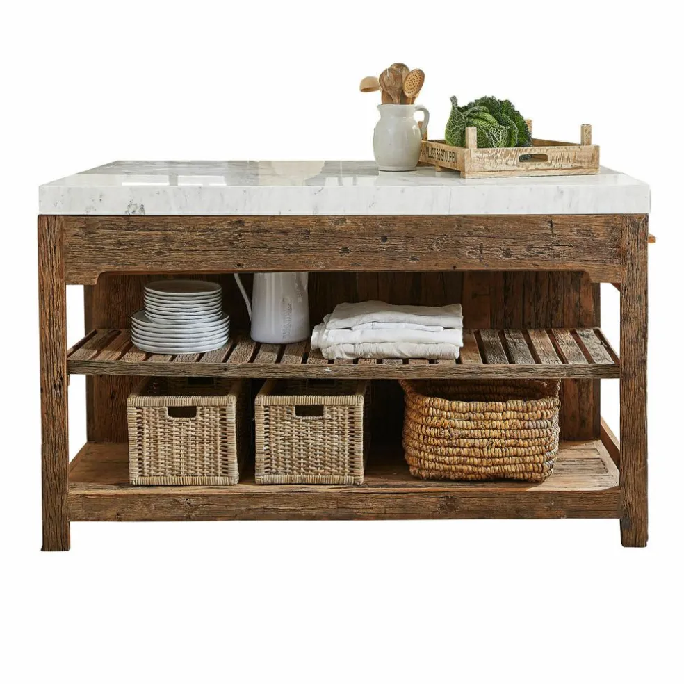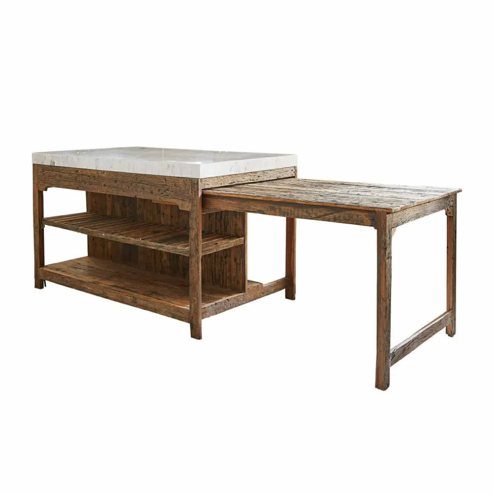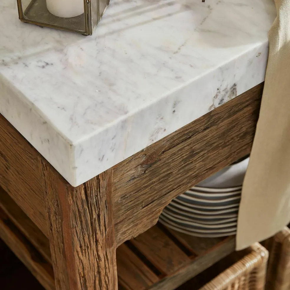 Der Küchenblock begeistert durch seine einzigartige Mischung aus edlen und rustikalen Materialien. Die Marmorplatte, die dem Möbelstück seinen exklusiven Unikat-Charakter verleiht, sitzt auf einem stabilen Gestell aus wiederaufbereitetem Salbaumholz. Die warme, charakteristische Maserung und der natürliche Used-Look schaffen eine gemütliche Atmosphäre in jeder Küche. Zwei großzügige Regalböden bieten reichlich Stauraum für Töpfe, Pfannen und Küchenzubehör, während der seitlich ausziehbare Tisch zusätzliche Arbeitsfläche oder Platz für eine schnelle Mahlzeit schafft. Dieses Möbelstück bringt nicht nur Funktionalität, sondern auch ein einzigartiges Flair in Ihr Zuhause.