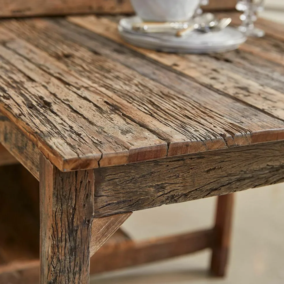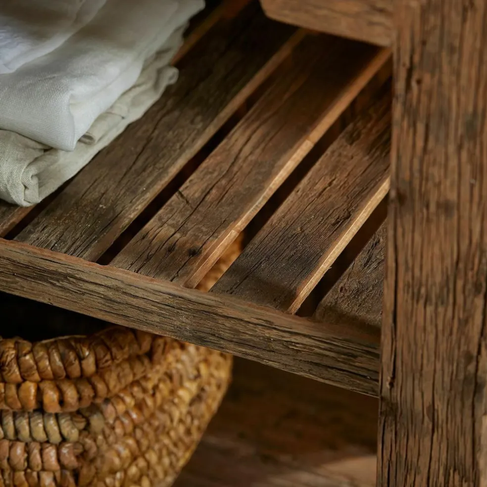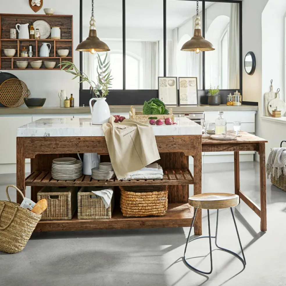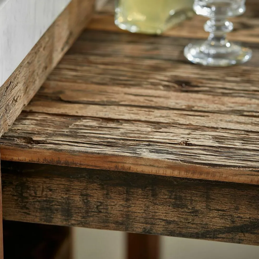 Der Küchenblock begeistert durch seine einzigartige Mischung aus edlen und rustikalen Materialien. Die Marmorplatte, die dem Möbelstück seinen exklusiven Unikat-Charakter verleiht, sitzt auf einem stabilen Gestell aus wiederaufbereitetem Salbaumholz. Die warme, charakteristische Maserung und der natürliche Used-Look schaffen eine gemütliche Atmosphäre in jeder Küche. Zwei großzügige Regalböden bieten reichlich Stauraum für Töpfe, Pfannen und Küchenzubehör, während der seitlich ausziehbare Tisch zusätzliche Arbeitsfläche oder Platz für eine schnelle Mahlzeit schafft. Dieses Möbelstück bringt nicht nur Funktionalität, sondern auch ein einzigartiges Flair in Ihr Zuhause.