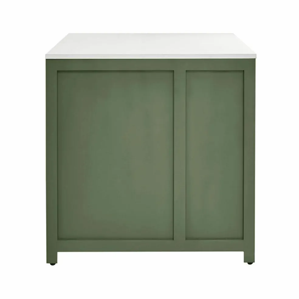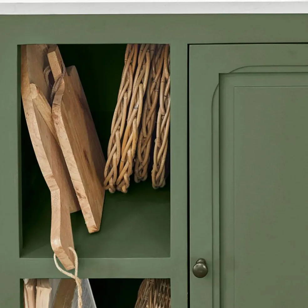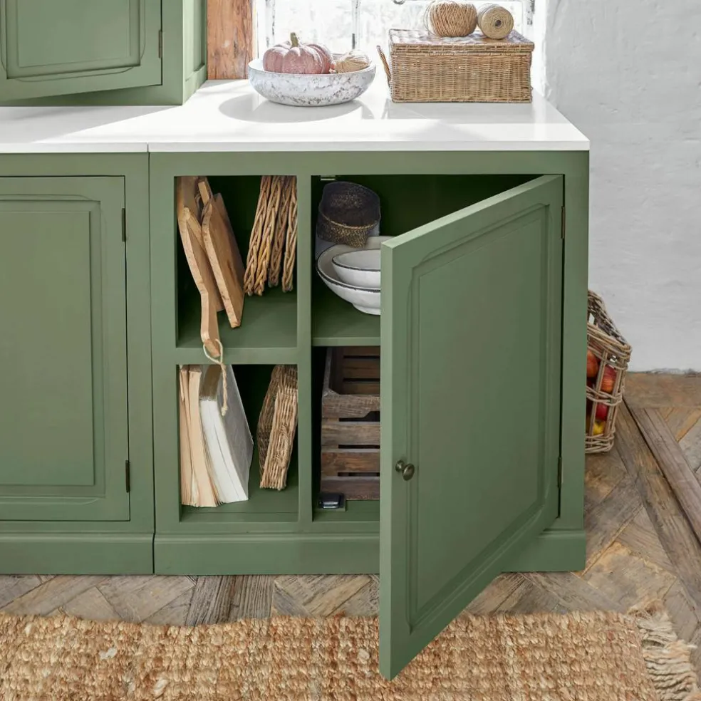 Ein Küchenschrank, der nicht nur praktisch ist, sondern auch mit seinem charmanten Design überzeugt. Das gelungene Zusammenspiel aus offener und geschlossener Aufbewahrung ermöglicht eine flexible Nutzung: Zwei offene Fächer setzen Lieblingsstücke gekonnt in Szene, während hinter der Tür genügend Platz für Geschirr, Vorräte oder Küchentextilien bleibt. Die robuste Quarzstein-Arbeitsplatte fügt sich nahtlos in das Gesamtbild ein und bietet eine pflegeleichte, langlebige Oberfläche. Die sanft grüne Lackierung unterstreicht den nostalgischen Landhaus-Charakter und lässt sich perfekt mit anderen Elementen der Serie kombinieren. Ob als zusätzlicher Stauraum oder als eigenständiges Highlight – dieser Küchenschrank macht jede Küche noch wohnlicher.