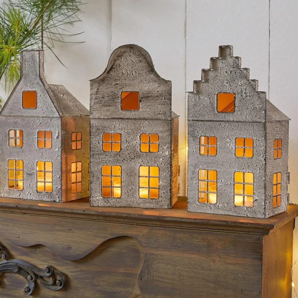 Kaum etwas wirkt idyllischer und anheimelnder als der Lichterschein der aus belebten Häusern fällt. Und mit diesen Laternen im 3er Set holen Sie sich das Idyll jetzt ganz einfach nach Hause. Die Windlichter in drei verschiedenen Formen geben zusammen eine dekorative Häuserzeile ab, sind jedoch auch einzeln ein echtes Highlight für drinnen und draußen. Gefertigt und handbearbeitet aus Eisen wurden die Häuser im Kleinformat mit einer dekorativen Antik-Lasur versehen. Übrigens: In jede Laterne passt je eine kleine Stumpenkerze oder ein großes Teelicht – sie bietet aber auch den passenden Rahmen für allerlei kreative Deko-Ideen. Lassen Sie Ihrer Fantasie freien Lauf – das Ergebnis wird in jedem Fall sehenswert.