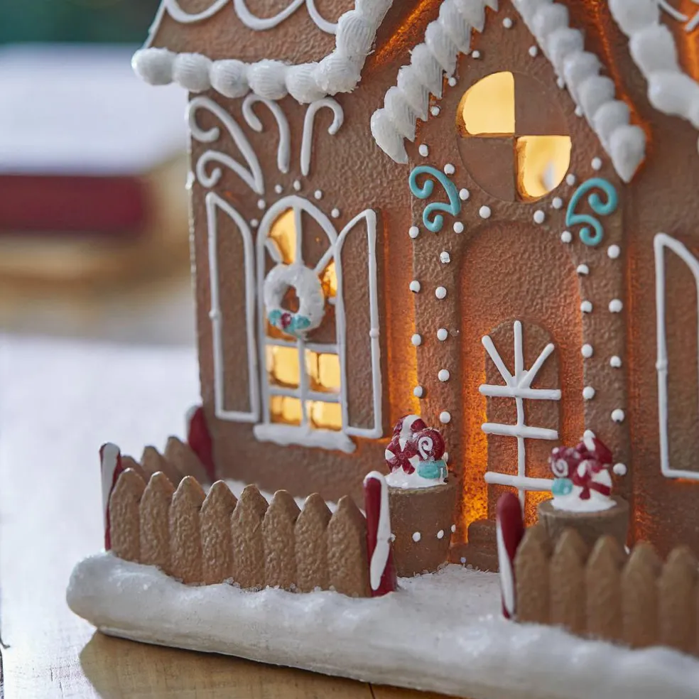 Das perfekte Lebkuchenhaus existiert – und dieses ganz besondere Modell bleibt auch noch für immer schön, denn es ist die detailgenaue Nachbildung eines echten Lebkuchenhäuschens aus Polyresin. Somit trocknet es nie aus und versprüht alle Jahre wieder seinen Zauber. Sämtliche Details wie Kränze, Schnee und Zuckerstangen sind liebevoll ausgestaltet, und es erscheint wirklich wie aus duftendem Lebkuchenteig und Zuckerguss geschaffen. Zudem lässt sich dieses Lieblingsstück auch noch mit bereits integrierten LEDs illuminieren, sodass eine besonders feierliche Optik entsteht. Träumen Sie von der guten, alten Weihnachtsbäckerei und schmücken Sie Ihr Zuhause im festlichen, nostalgischen Stil. Erleben Sie ein wahres Highlight auf dem Tisch, am Fenster oder auf einer Anrichte platziert. Ein wirklich niedliches Accessoire für die Festtage, an dem Sie sich immer wieder erfreuen werden.