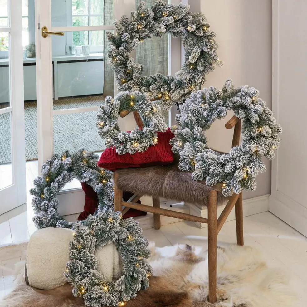 Fünf wunderschöne Kränze, die ganz natürlich aussehen. Die Struktur und Optik unterscheidet sich kaum von echten Nadeln. Sie sind charmant mit Kunstschnee bestäubt, sodass man bei ihrem Anblick an verträumte Winterwälder denkt. Das edle Quintett in unterschiedlichen Größen sorgt dank integrierter Lichterketten mit warmweißen LEDs für eine sehr heimelige Beleuchtung. Mit diesem Set können Sie Ihr ganzes Haus festlich schmücken, und das alle Jahre wieder. Sie bleiben schließlich immer frisch und nadeln nie. Ein geschmackvoller Akzent, der Ihnen den Winter verschönert. An der Wand, auf dem Tisch oder einer Anrichte, im Fenster oder einladend an der Tür platziert holen Sie sich hiermit eine naturnahe und festliche Atmosphäre nach Hause. Das Set harmoniert mit wirklich jedem Ambiente. 95 LEDs sorgen insgesamt für gemütliches Licht. Die edlen Kränze werden mit Batterien erleuchtet, sodass keine störenden Kabel das feierliche Bild stören.