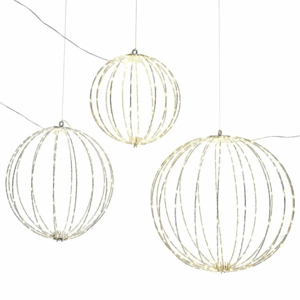 Das LED-Kugel 3er Set verzaubert mit einem modernen, filigranen Design und strahlt ein warmweißes Licht aus, das sowohl im Innenbereich als auch draußen für stimmungsvolle Akzente sorgt. Die Kugeln sind je mit 360, 240 bzw. 192 LEDs bestückt. Dank ihrer wetterfesten Bauweise sind die Kugeln perfekt für den Garten, die Terrasse oder den Balkon geeignet. Mit unterschiedlichen Größen lässt sich das Set flexibel arrangieren – ob aufgehängt, auf dem Boden platziert oder als Highlight in Ihrer Außendekoration. Genießen Sie eine gemütliche Beleuchtung, die das ganze Jahr über sowohl drinnen als auch draußen für eine behagliche Atmosphäre sorgt.
