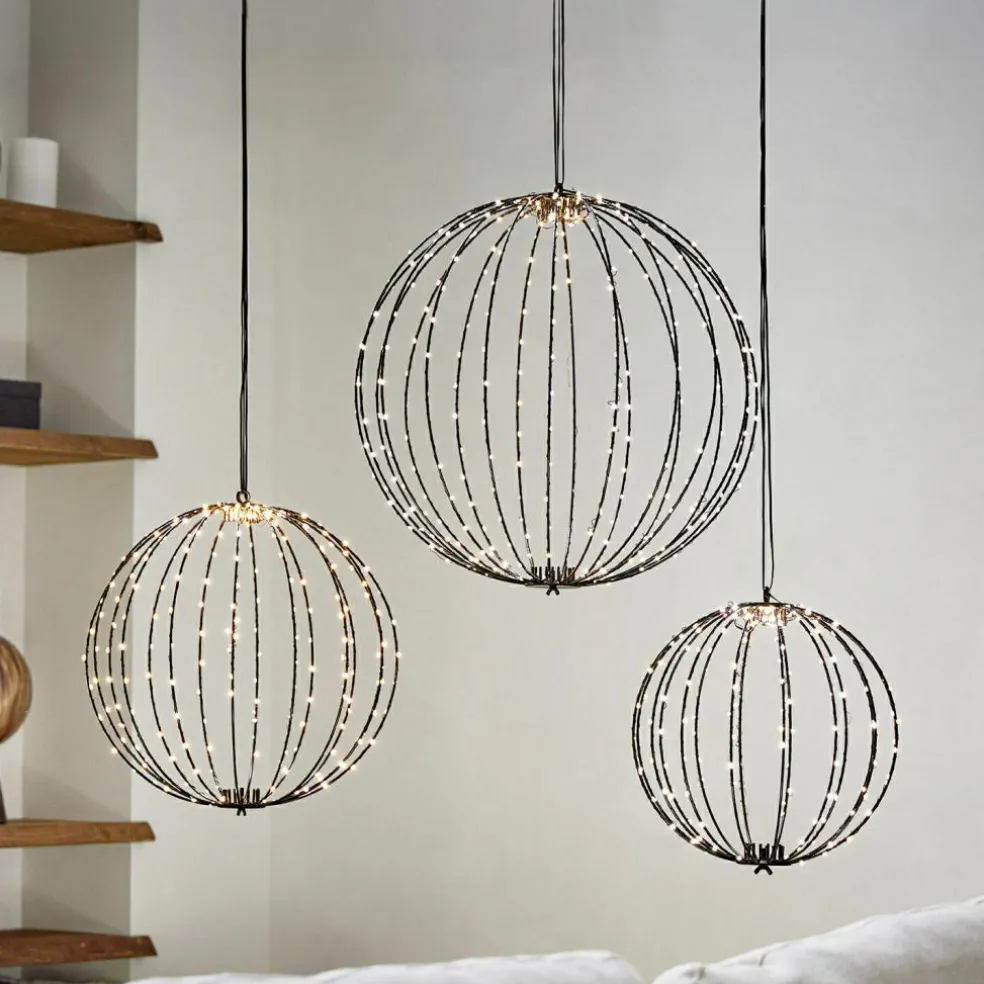Das LED-Kugel 3er Set verzaubert mit einem modernen, filigranen Design und strahlt ein warmweißes Licht aus, das sowohl im Innenbereich als auch draußen für stimmungsvolle Akzente sorgt. Die Kugeln sind je mit 360, 240 bzw. 192 LEDs bestückt. Dank ihrer wetterfesten Bauweise sind die Kugeln perfekt für den Garten, die Terrasse oder den Balkon geeignet. Mit unterschiedlichen Größen lässt sich das Set flexibel arrangieren – ob aufgehängt, auf dem Boden platziert oder als Highlight in Ihrer Außendekoration. Genießen Sie eine gemütliche Beleuchtung, die das ganze Jahr über sowohl drinnen als auch draußen für eine behagliche Atmosphäre sorgt.