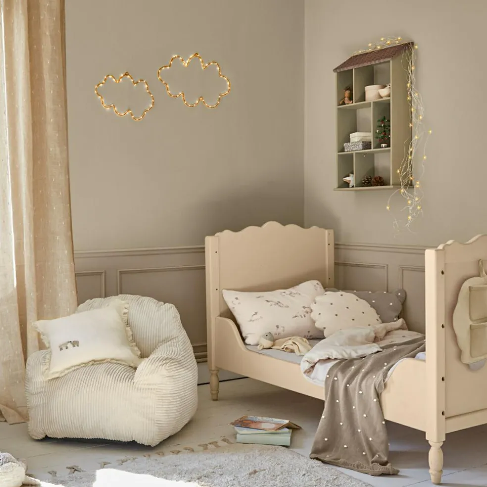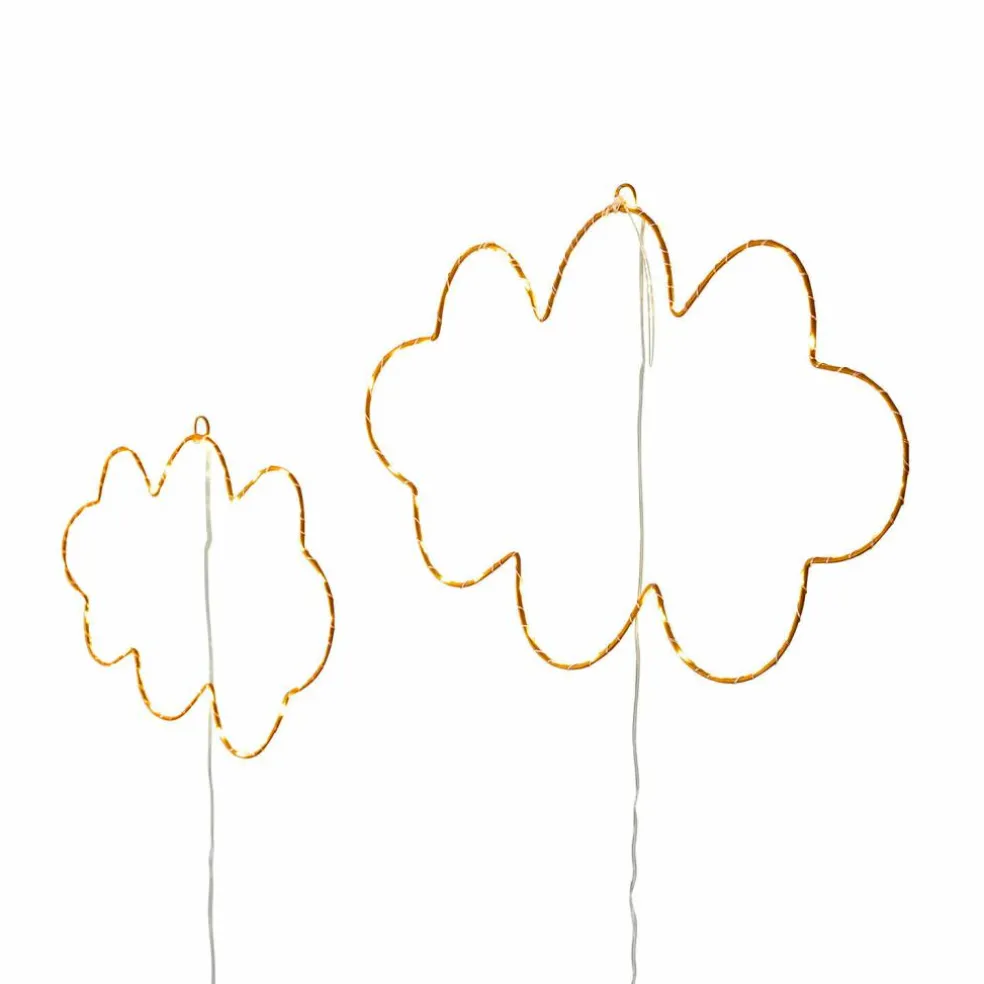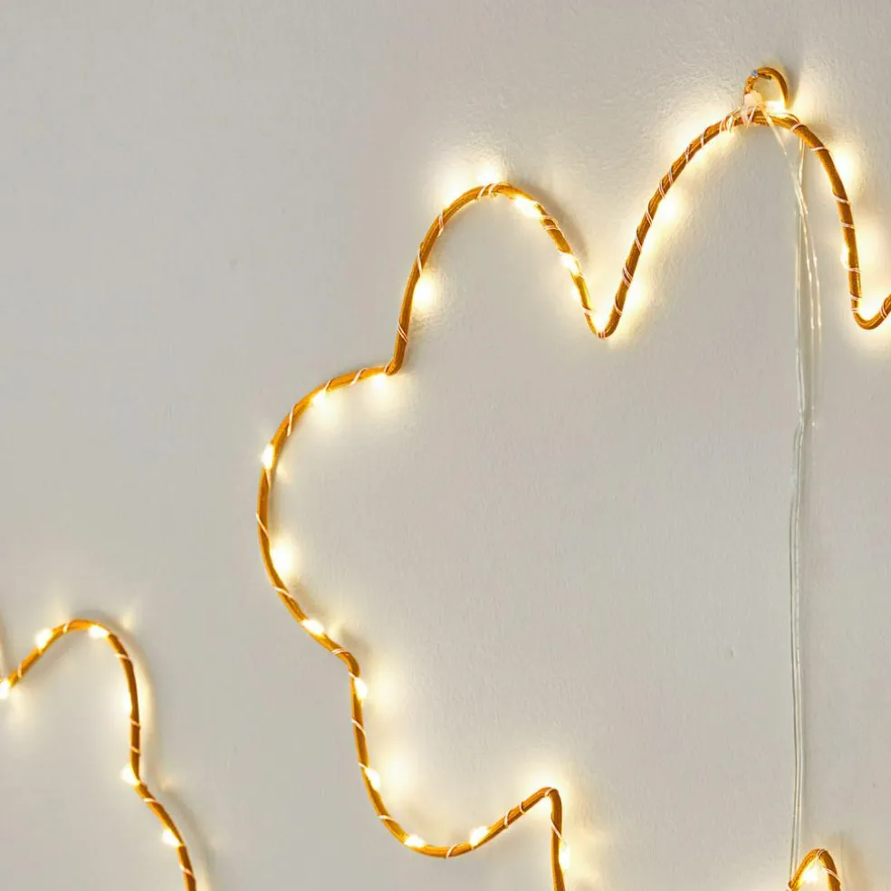 Wenn der Tag zur Ruhe kommt und kleine Abenteurer sich in ihre Träume kuscheln, beginnt der stille Zauber dieser beiden Wolkenlichter. Zart geformt aus goldfarbenem Draht und umwoben von leuchtenden LED-Punkten, schweben sie wie leise Gute-Nacht-Wünsche über dem Kinderbett oder an der Wand. Die warmweiße Beleuchtung schafft eine sanfte Atmosphäre, die Geborgenheit schenkt – perfekt für Abendrituale oder kleine Lichtinseln im Raum. Zwei unterschiedliche Größen laden dazu ein, kreativ zu dekorieren. Einfach aufzuhängen, leicht zu lieben – diese Lichtwölkchen begleiten durch viele schöne Nächte.