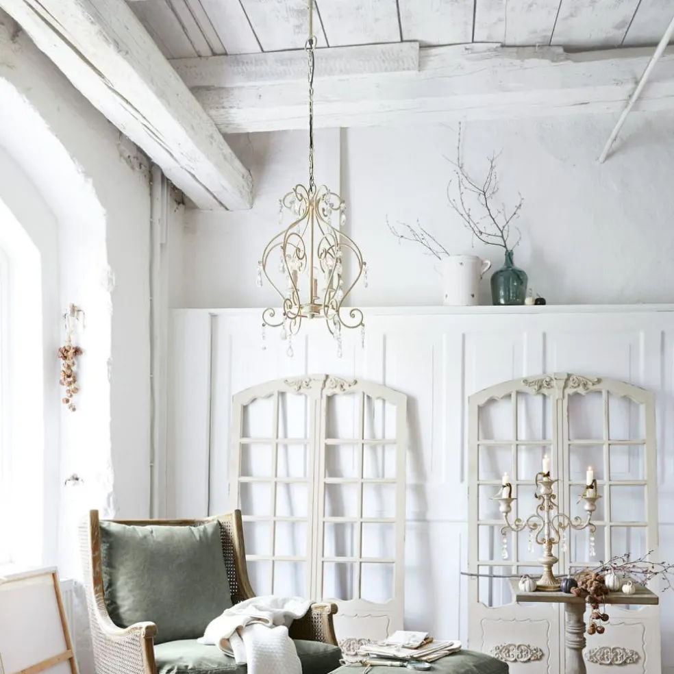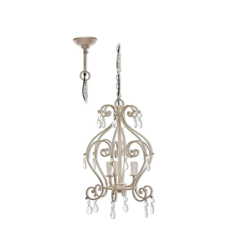 Ein wertvolles Highlight mit beinahe royalem Flair. Der wunderschöne, luxuriöse Leuchter bezaubert mit seinem romantisch geschwungenen Gestell aus Eisen. Dieses zieren funkelnde Glas-Prismen – ein reizendes Extra. Das kunstvolle Design wird mit drei Glühbirnen erleuchtet, sodass Sie eine ausgesucht schöne Lichtstimmung erleben. An den Lampenfassungen befinden sich kleine Tropfenförmchen, die herabfließendes Wachs hübsch nachahmen. Als komme dieser Leuchter aus geraumer Vorzeit und wurde damals, wie üblich, mit Kerzen betrieben. Ein hübsches kleines Detail. Zudem ist das elegante Kunstwerk eine wahre optische Zierde, ob an- oder ausgeschaltet. Es passt hervorragend zum Shabby-Chic und lässt das Herz aller Romantiker höher schlagen. Eine gekonnte Wahl für Wohn- oder Schlafzimmer, an der Sie lange Freude haben werden. Luxus pur mit zartem Charme – ein absolutes Lieblingsstück.