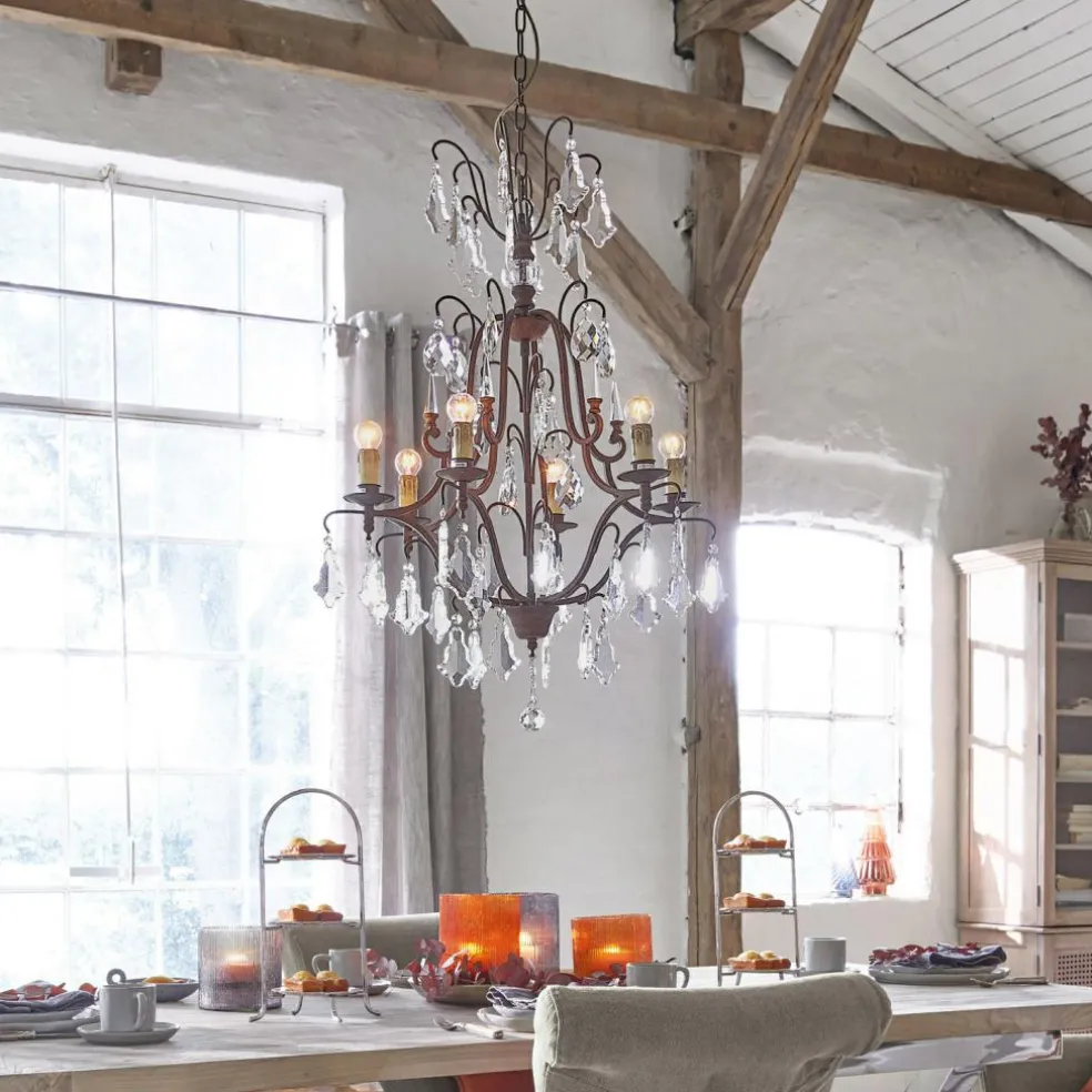 Ein eleganter Salon, schimmernde Roben und kostbares Geschmeide, das im Schein unzähliger Kerzen funkelt – so oder ähnlich könnte das Ambiente gewesen sein, in dem dieser Leuchter früher zu Hause war. Die französische Salonkultur stellte die perfekte Verschmelzung von elegantem Ambiente und kulturellem Leben dar. Wie die antiken Originale wirkt auch dieser Leuchter, als hätte er literarischen Gesprächen zugehört, berühmten Musikern gelauscht und ganz nebenbei Abend für Abend den Salon in ein stimmungsvolles Licht getaucht. Dafür sorgten früher die Kerzen, deren Schein sich in den unzähligen Glasperlen spiegelte, die wie Perlenketten den 6-armigen Leuchter schmücken und an deren Ende als krönender Abschluss kunstvoll facettierte Glasprismen strahlen. Bei dem Glas handelt es sich um edle Glasprismen, die dafür berühmt sind, das einfallende Licht besonders schön zu brechen. Ein Effekt, den Sie schon bei Tag bewundern können, wenn ab und zu ein Sonnenstrahl auf den Leuchter im Zimmer fällt, der aber vor allem am Abend seine ganze Strahlkraft entfaltet, wenn die sechs Kerzenbirnen erstrahlen. Denn natürlich müssen Sie für die zauberhafte Atmosphäre im Raum keine echten Kerzen entzünden, sondern einfach nur den Lichtschalter betätigen. Die Illusion echten Kerzenlichts unterstützt die hübsche Wachstropfenoptik an den Lampenfassungen. Ein Leuchter, der perfekt den Esstisch beleuchtet, der aber auch im Schlafzimmer oder im Entrée für luxuriöses Flair sorgen wird.