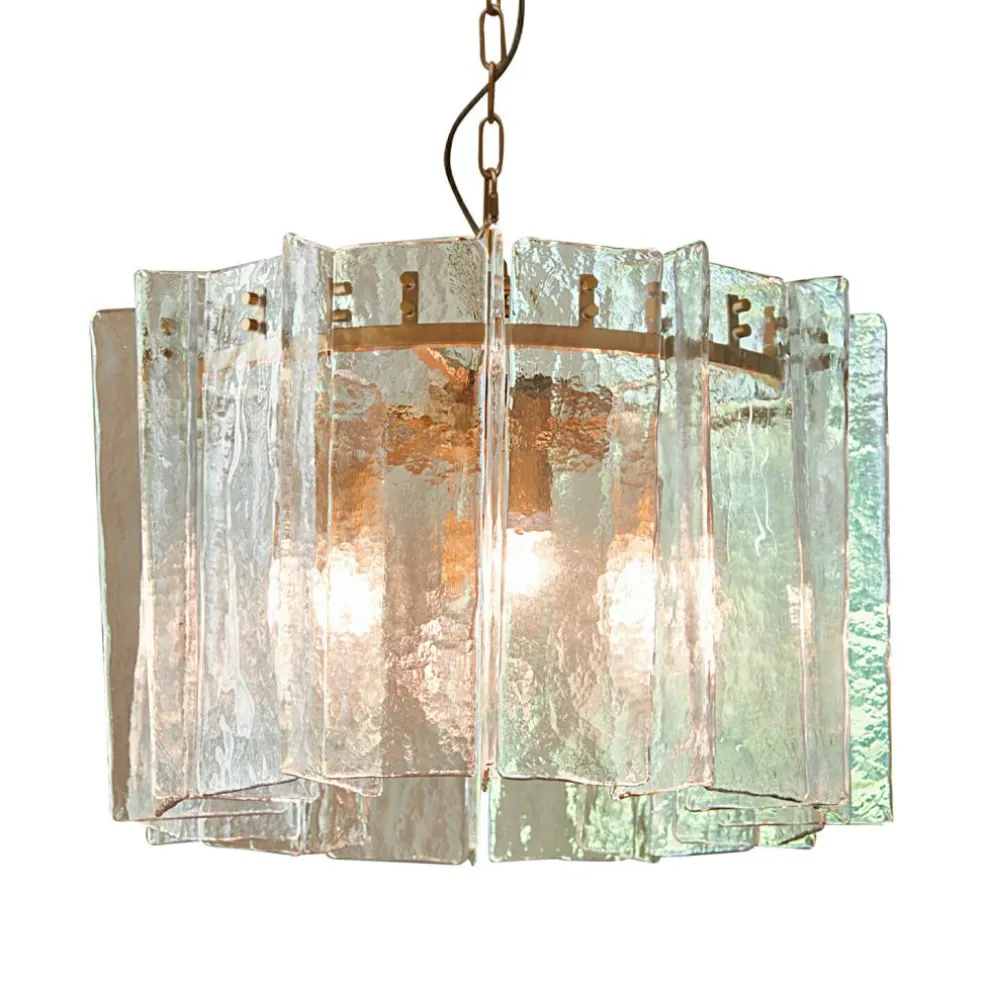 Wie Eiskristalle, die sich sanft in der Luft sammeln, um eine Form zu bilden – so wirkt diese außergewöhnliche Hängelampe. Ihre rundum angeordneten Glasplatten mit welliger Struktur erinnern an gehämmertes Eis und lassen das Licht in lebendigen Facetten tanzen. Besonders am Abend entfaltet sich die volle Magie: Jede einzelne Platte bricht das Licht anders, sodass ein lebendiges Spiel aus Schatten und Glanz entsteht. Der goldfarbene Rahmen bildet dazu einen warmen Kontrast und bringt ein Hauch von Glamour in den Raum – ob über dem Esstisch, in hohen Fluren oder als Statement-Piece in der Leseecke.