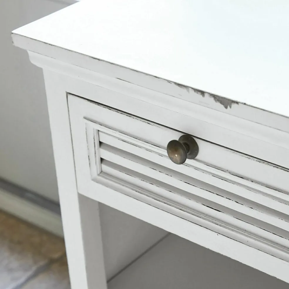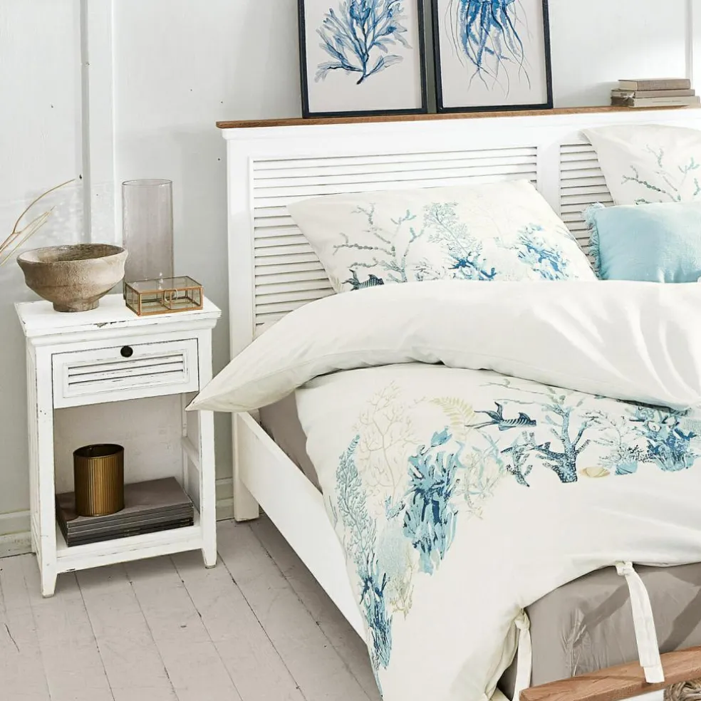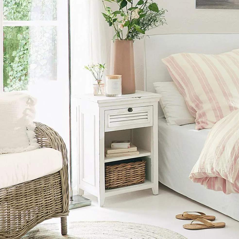 Lust auf ein bisschen Long-Island-Feeling in Ihrem Schlafraum? Mit viel Weiß, mit Naturmaterialien wie Rattan und Wohntextilien in Naturtönen können Sie im Nu sommerlich maritimes Flair entstehen lassen. Dann werden Sie sich fühlen, als würden Sie sich in einem der großen, weißen Holzhäuser auf den Hamptons zum Schlafen legen, während das entfernte Rauschen des Ozeans Sie in den Schlaf wiegt. Achten Sie beim Einrichten aber auch bei den kleineren Möbeln auf den richtigen Look. Dieser Nachttisch im 2er Set versprüht das Flair von Frische und lässiger Leichtigkeit, setzt aber zugleich auf traditionelle Werte wie edle Materialien und hochwertige Verarbeitung. Edel ist das Mangoholz ohne Frage, als Nebenprodukt des Obstanbaus ist es aber außerdem nachhaltig. In puncto Verarbeitungsdetails hat der Möbelschreiner mit diesem Nachttisch ein kleines Meisterwerk geliefert. Von der typischen Kranzleiste über die Kassettenverzierungen an den Seiten bis zu den Lamellen an der Schublade verkörpert der Nachttisch stimmig den zeitlos schönen Long-Island-Stil, während er auf der Platte, in den Schubladen und in den beiden offenen Regalfächern praktische Ablagefläche bietet. Das dezente Antik-Finish macht den authentischen Look perfekt.