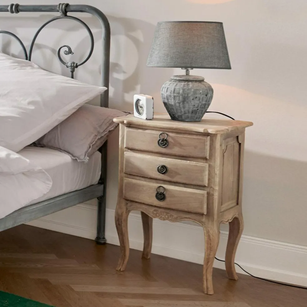 Dieser wunderschöne Nachttisch punktet als Vorzeigestück hochwertiger Handwerkskunst. Mit liebevollen Details wie den geschwungenen Beinen und den aufwendig ausgearbeiteten Verzierungen im stilvollen Vintage-Look überzeugt das kleine aber feine Möbelstück auf ganzer Linie. Der Nachttisch ist aus massiven Mangoholz gefertigt und mit einer charmanten Patina versehen. Ausgestattet mit insgesamt drei Schubladen bietet das kleine Möbelstück sowohl im Inneren als auch auf der Ablagefläche oben ausreichend Platz für jede Menge Kleinkram: Brille, Schmuck, Wecker oder die Gute-Nacht-Lektüre. Kunstvoll ausgeformte Eisengriffe dienen zum Öffnen der Schubfächer und zum unterstreichen des zauberhaften Vintage-Charmes. Optimal als Nachttisch, Beistellkommode oder Alternative zum Beistelltisch.