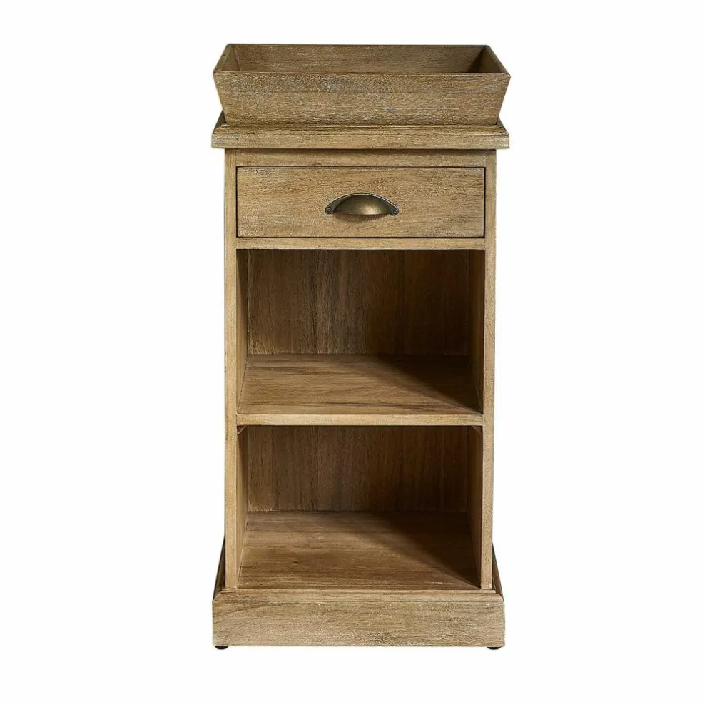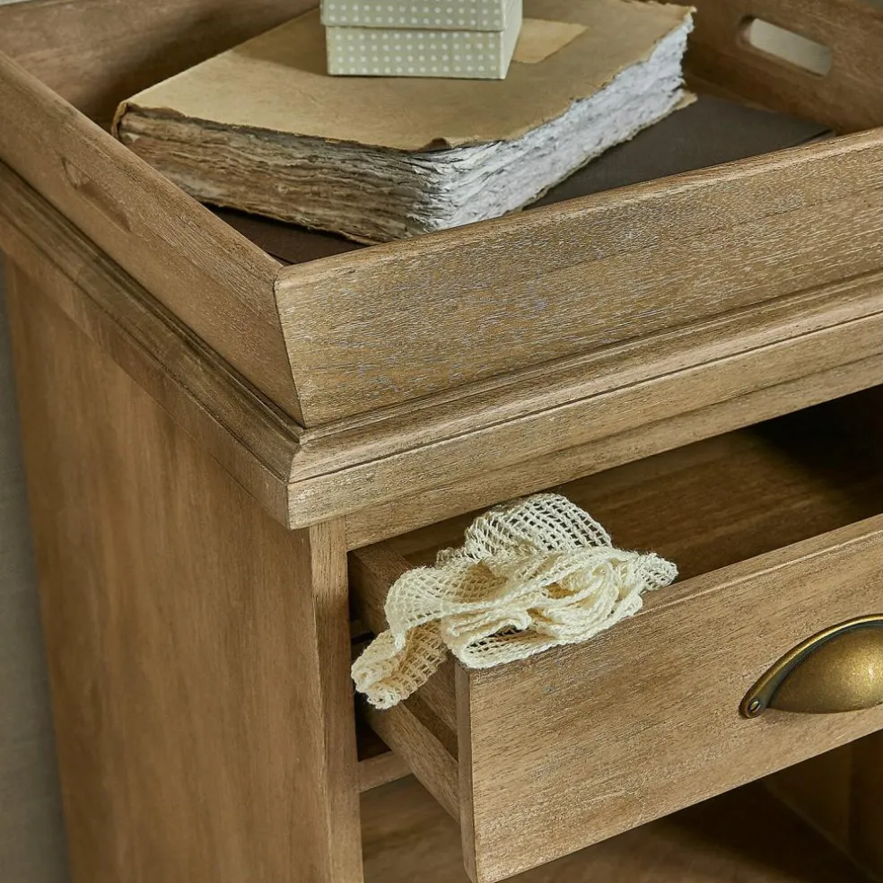 Stellen Sie sich vor, Sie bringen einen Hauch von Vintage-Charme in Ihr Schlafzimmer mit diesem Nachttisch aus Mangoholz. Das sorgfältig aufgetragene Antik-Finish, erzählt eine Geschichte von Eleganz und feiner Handwerkskunst. Die oberste Ablage, entworfen in der Form eines Tabletts, fügt eine funktionale und stilvolle Note hinzu, ideal, um Ihre Lieblingslektüre oder ein gemütliches Nachtlicht zu beherbergen. Die Ablage lässt sich ganz einfach, wie ein Tablett, abnehmen und leicht transportieren. Unten bietet offener Stauraum zusätzliche Ablagemöglichkeiten, während die Schublade mit ihrem ansprechenden Metallgriff einen geschützten Ort für persönliche Gegenstände schafft.