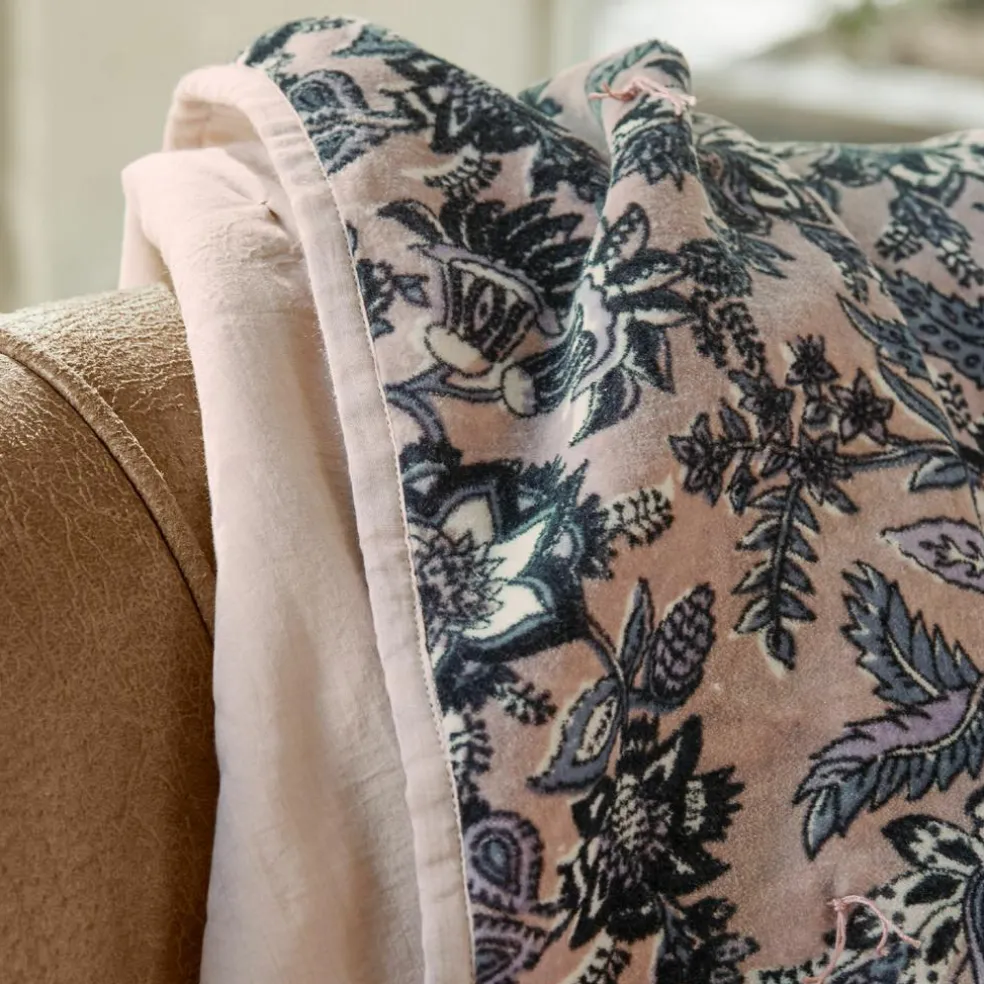 Tauchen Sie ein in den luxuriösen Komfort dieses handgefertigten Plaids aus edlem Baumwollsamt. Jedes Detail, von den kunstvollen Drucken bis hin zu den liebevoll angebrachten losen Fäden, zeugt von höchster Handwerkskunst und einem unvergleichlichen Gespür für Ästhetik. Die Vorderseite ziert ein farbenfrohes, florales Muster, das mit seinen sanften Tönen und feinen Details ein wahrer Blickfang ist. Die Rückseite ist in einer stilvollen Unifarbe gehalten, was dem Plaid eine zeitlose Eleganz verleiht und es vielseitig einsetzbar macht. Egal ob als wärmende Decke auf dem Sofa oder als dekoratives Element im Schlafzimmer – dieses Plaid verbindet Funktionalität mit einem unvergleichlichen Sinn für Stil und Qualität.
