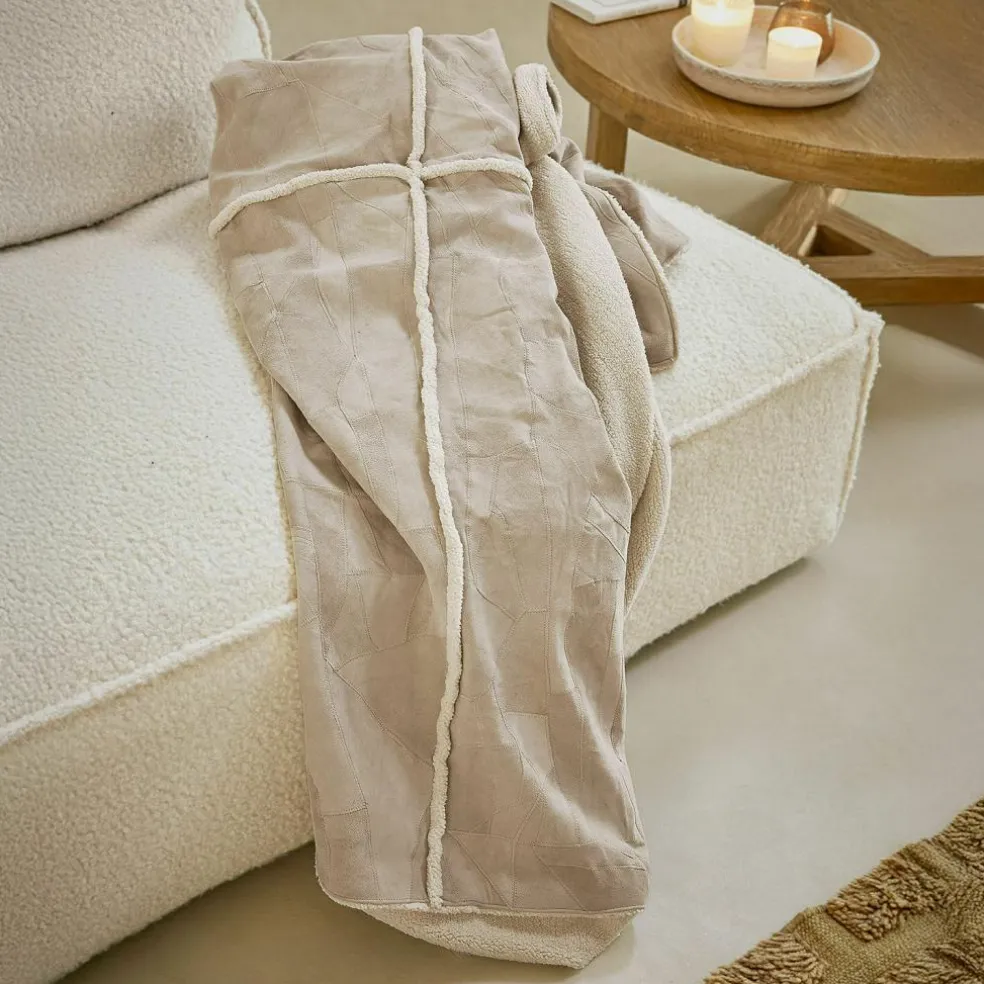 Ein Plaid, das Geschichten erzählt: Aus zahlreichen Lederstücken in zarten Naturnuancen wurde auf der Vorderseite ein kunstvolles Patchwork gefertigt – jedes einzelne Element trägt seine eigene Handschrift und verleiht der Decke ihren einzigartigen Charakter. Die natürliche Oberfläche des Leders fühlt sich angenehm griffig an und bringt Wärme in jede Einrichtung. Die Rückseite überrascht mit einem sanften Teddyfell aus Baumwolle, das sich wohlig weich an die Haut schmiegt. Diese außergewöhnliche Kombination macht das Plaid nicht nur zu einem gemütlichen Begleiter an kühlen Tagen, sondern auch zu einem stilvollen Wohnaccessoire mit Charme und Tiefe.
