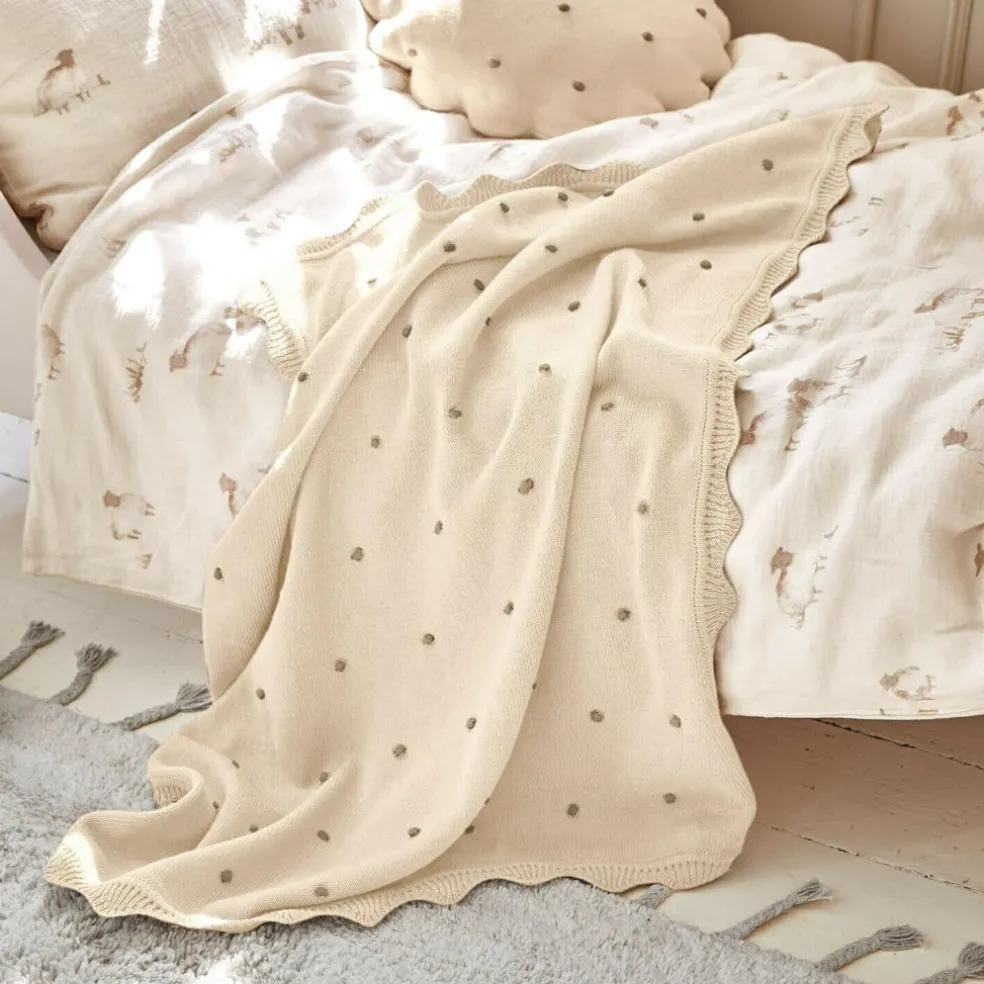 Mit diesem bezaubernden Plaid wird jedes Kuscheln zum kleinen Wohlfühlritual. Die weich gestrickte Baumwolle schmiegt sich sanft an die Haut und lädt zum Träumen ein – sei es im Kinderbett, auf dem Arm oder unterwegs im Kinderwagen. Die eingestickten Mini-Punkte sorgen für liebevolle Details und setzen verspielte Highlights. Der geschwungene Rand erinnert an eine Wolke und verstärkt die sanfte Anmutung dieses Lieblingsstücks. Ob als Geschenk zur Geburt oder als treuer Alltagsbegleiter – diese Decke schenkt Wärme, Geborgenheit und ein Lächeln.
