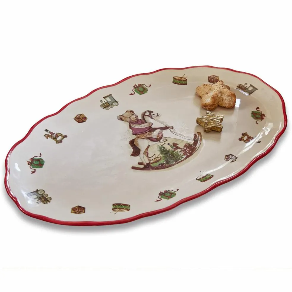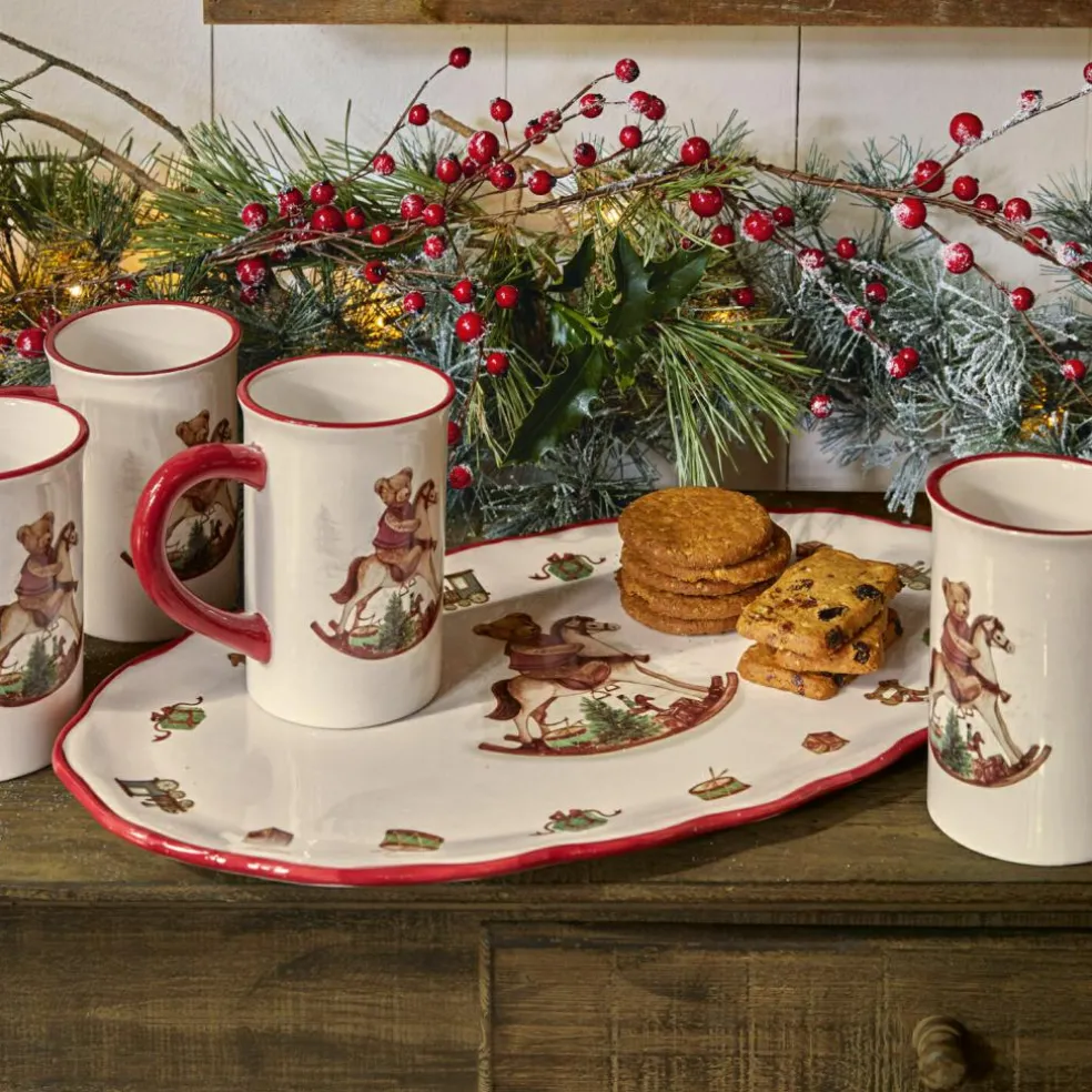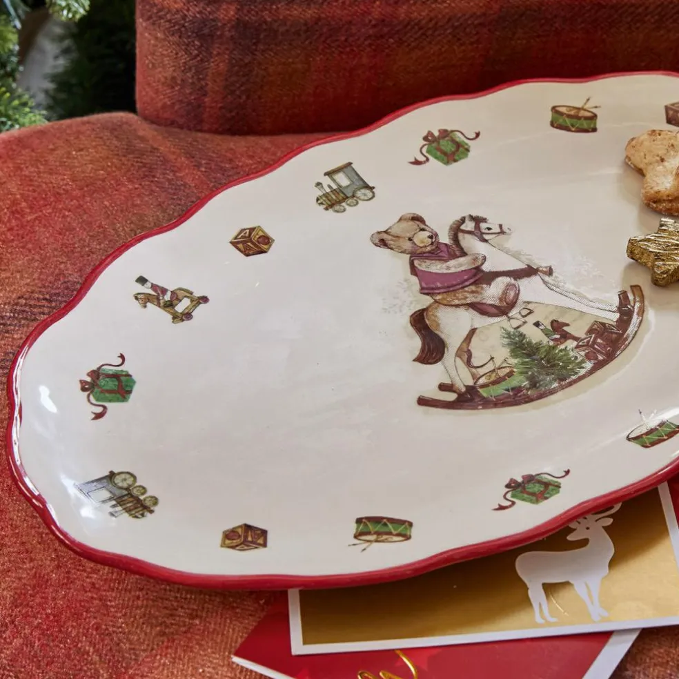 Erschaffen Sie Ihre ganz eigene Weihnachtstradition und freuen Sie sich auf ein sehr nostalgisches und ausgesprochen detailverliebtes Design, welches den Zauber unbeschwerter Kindertage zu Ihnen bringt. Die wundervoll von Hand bemalte Platte aus Steingut ist fein ausgestaltet – zuckersüße Teddys und viele festliche Details schmücken sie. Die Motive und die Farbgebung sind angenehm traditionell gehalten. Der fröhliche Anblick bringt das Gefühl der guten, alten Zeit in Ihr Zuhause. Der Rand ist farblich abgesetzt – ein weiteres, gekonntes Detail. Die wertvolle Platte lässt sich sehr vielseitig nutzen, etwa pur als stimmungsvolle Dekoration, mit Nüssen und Äpfeln bestückt oder auch mit Dekorativem wie Weihnachtskugeln und Tannenzapfen verziert. In jedem Fall zieht hiermit die perfekte Weihnachtsstimmung ein – setzen Sie ein Highlight auf dem Tisch oder einer Anrichte und lassen Sie sich von dem traditionsbewussten, freundlichen Design zu den Feiertagen ein Lächeln ins Gesicht zaubern.