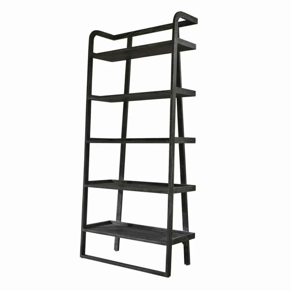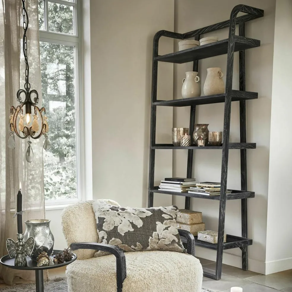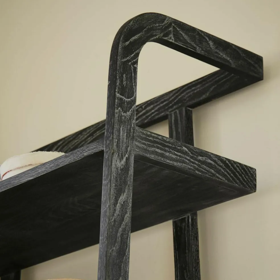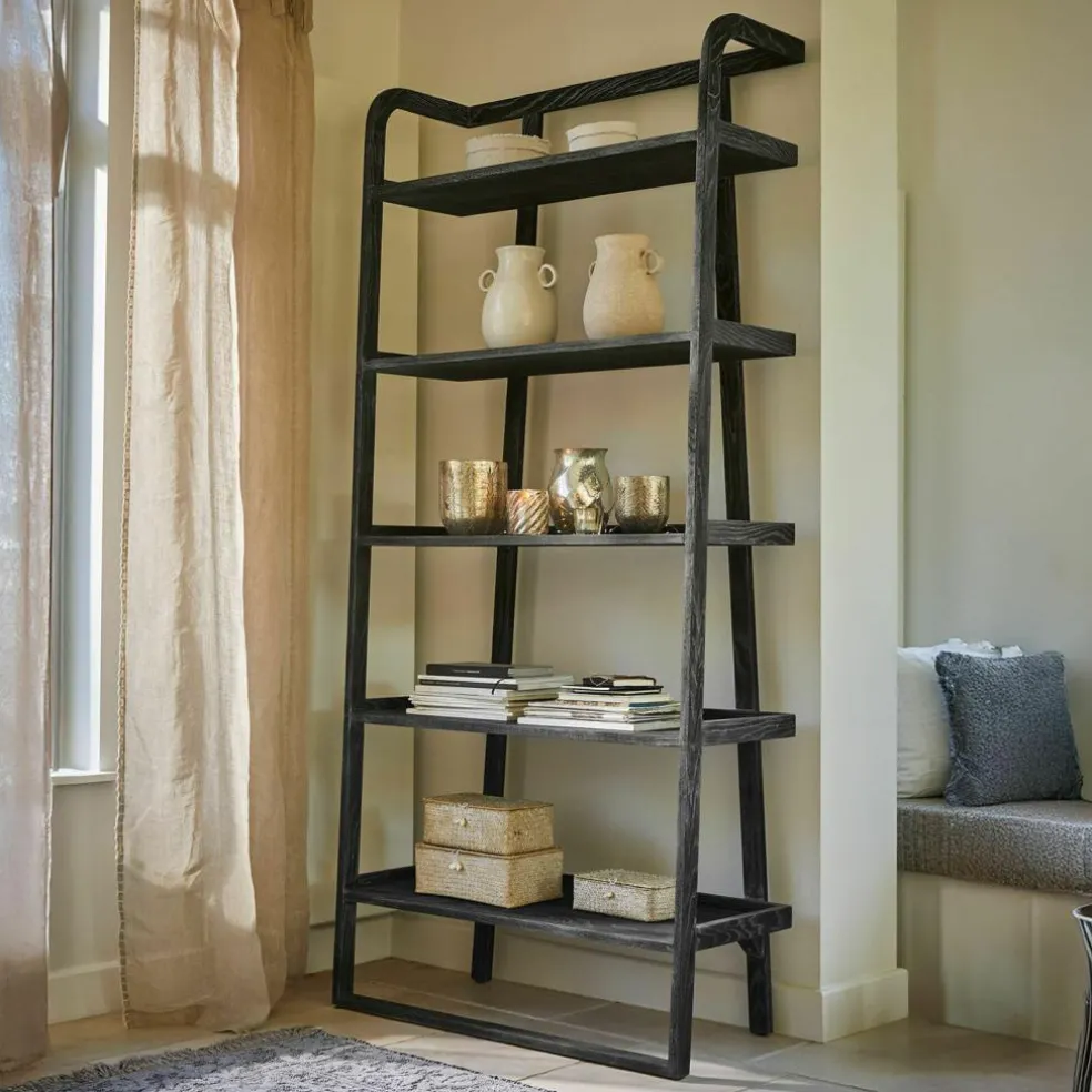 Dieses Regal erzählt von Stärke, Ruhe und natürlicher Tiefe. Gefertigt aus massivem Eichenholz und veredelt mit einem Antikschwarz-Finish, das die markanten Maserungen nicht verdeckt, sondern bewusst durchscheinen lässt, wird es zum Blickfang mit Charakter. Die abgestufte Form erinnert an ein architektonisches Statement, das nicht nur optisch Akzente setzt, sondern auch durch seine fünf großzügigen, fest integrierten Ablagen punktet. Bücher, Deko oder Körbe finden hier ihren Platz – und werden von der dunklen Holzoberfläche besonders wirkungsvoll in Szene gesetzt. Ein Möbelstück, das Haltung zeigt.