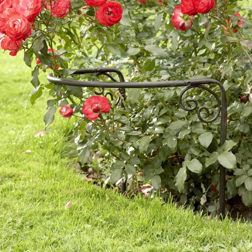 Sie möchten Ihre wunderschönen, aber zunehmend wild wachsenden Strauchrosen zukünftig im Zaun halten. Kein Problem. Diese halbrunde und äußerst stilvolle Rosenstütze aus antikschwarzem Eisen bildet den passenden Schutz und vermeidet zugleich, dass die schönen Pflanzen vermehrt umknicken. Außerdem ist die Rosenstütze mit den minimalen Ornamenten an den beiden Enden zugleich eine schöne Idee, um empfindlichen Pflanzen auch an der Hauswand oder an einer Mauer entsprechenden Schutz zu bieten. Die Handhabung ist ganz einfach, denn das Eisengestell wird an den zwei Endpfeilern nur in die Erde gesteckt. Unser Tipp: zwei Rosenstützen bilden zusammengesteckt einen Kreis und rahmen die Stauden und Rosen somit komplett ein.