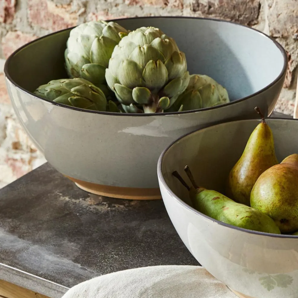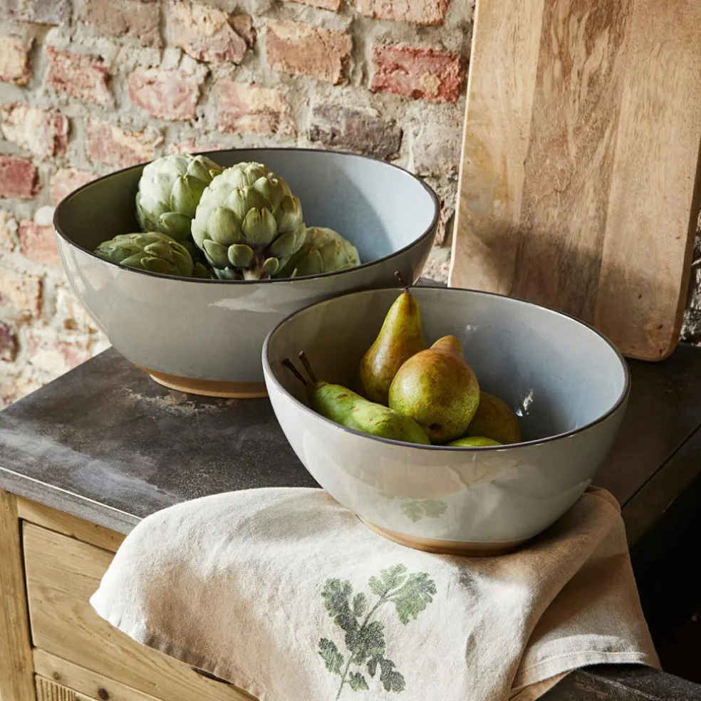 Dieses charmante Duo bringt einen Hauch Mittelmeer auf Ihre Tafel. Die schönen Schalen aus Steinzeug haben eine reizvolle Optik, welche an Handwerkskunst aus dem sonnigen Süden erinnert. Leichte Unebenheiten sind hier ganz bewusst gestaltet, um dem Set noch mehr individuelles Flair zu verleihen. Der edle, dunkle Rand ist ein hübsches Detail, so wie auch der unglasierte Boden. Sie erhalten zwei Größen im Set. Die beiden stilvollen Schalen lassen sich sehr vielseitig nutzen, etwa um Pasta oder Salat zu genießen. Oder arrangieren Sie Oliven und Nüsschen darin, servieren Sie eine Suppe oder naschen Sie frisch geschnittenes Obst daraus. Wer möchte, könnte auch dekorative Arrangements erschaffen, vielleicht mit Trockenblüten und Muscheln befüllt. Und auch zum Aufbewahren kleiner Dinge wie Haarnadeln bieten die attraktiven Schalen sich an. Freuen Sie sich auf zwei echte Multitalente.