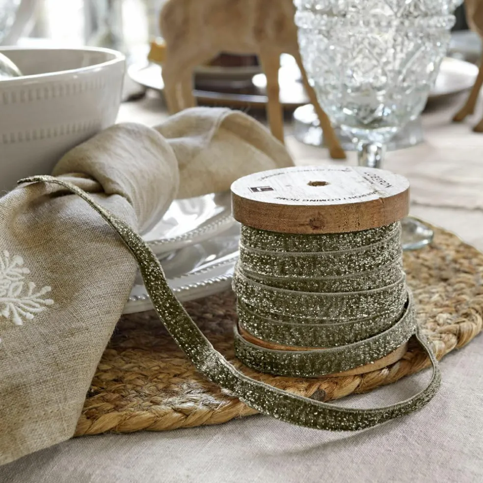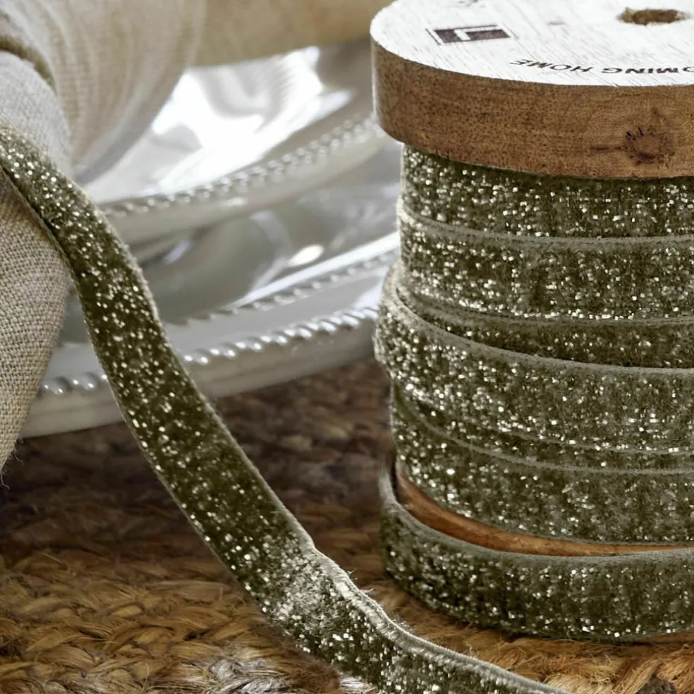 Tauchen Sie ein in die Welt luxuriöser Dekorationen mit diesem exquisiten Samtband. Der samtartige Stoff schmeichelt Ihren Fingerspitzen, während der zarte Glitzer funkelnde Akzente setzt und für ein faszinierendes Spiel mit dem Licht sorgt. Aufgewickelt auf einer rustikalen Spule aus massivem Mangoholz, vereint dieses Band Funktionalität mit ästhetischem Genuss. Die Kombination aus der natürlichen Textur des Holzes und dem eleganten Schimmer des Bandes schafft eine harmonische Einheit, die jede kreative Arbeit veredelt. Mit einer Breite von 1 cm und einer Länge von 10 Metern bietet es reichlich Spielraum für Ihre kreativen Ideen. Ob als edles Geschenkband, funkelndes Detail in festlichen Dekorationen oder glamouröses Accessoire bei besonderen Anlässen – dieses Band verleiht allem eine zauberhafte Eleganz.