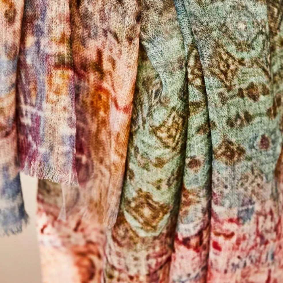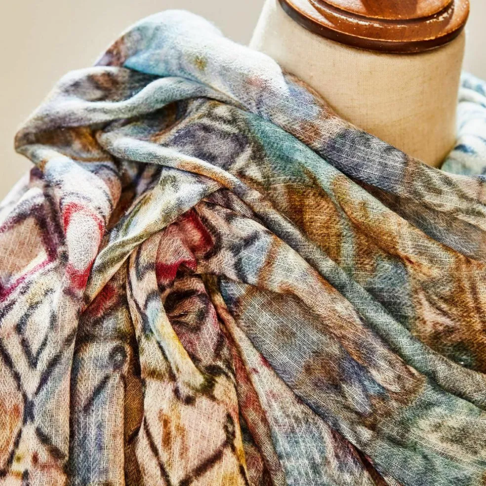 Dieser leichte, großzügige Schal bezaubert mit seinen kräftigen Farben und kunstvollen Mustern. Hier treffen sich ein orientalischer Print und ein reizendes Azteken-Muster. Er besteht aus hautfreundlicher Wolle mit etwas Seide und hat eine besonders weiche und angenehme Haptik. So setzt er einen stilvollen Akzent zu jedem Outfit und bringt Farbe in den Tag. Dieser edle Schal schützt den Hals vor Zugluft, und er lässt sich auch wunderbar als Stola um die Schultern tragen. Hiermit sehen Sie beim Gartenfest, dem Open Air Konzert oder in der Freizeit mit Freunden immer einfach toll aus.