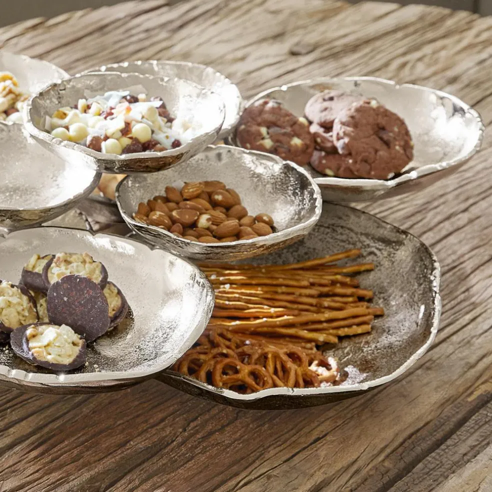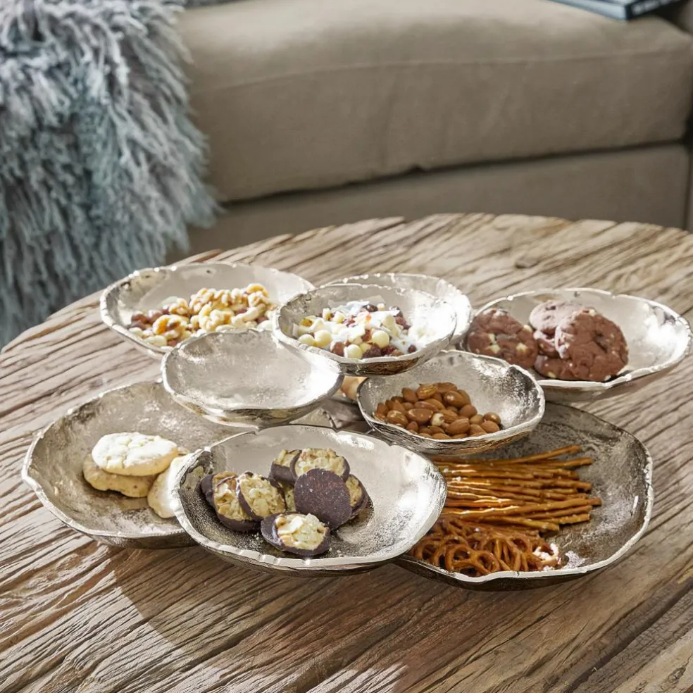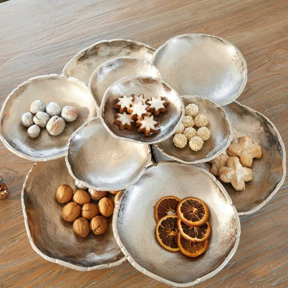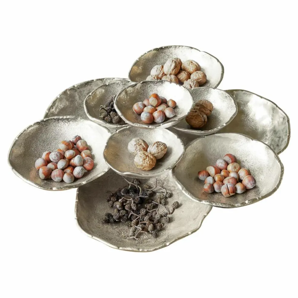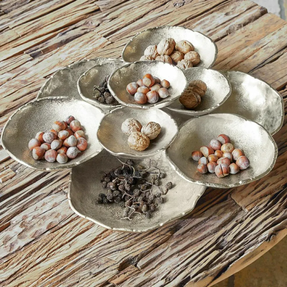 Luxus mit besonderer Note – erleben Sie ein hochwertiges Design voller Charme und Raffinesse. Die edle und recht große Schale aus Aluminiumguss hat eine besonders raffinierte Optik – als seien mehrere kleine Schalen zu einer großen zusammengefasst worden. So entstehen verschiedene Ebenen und eine ungewöhnliche Optik. Darin lassen sich wunderbar schöne Dinge arrangieren – Schmuck wie Ringe und Ohrringe, Edelsteine und Kristalle oder andere hübsche Gegenstände, hier können Sie kreativ werden. Schaffen Sie ein Highlight auf dem Tisch oder einer Anrichte und freuen Sie sich jeden Tag über dieses innovative und geschmackvolle Accessoire, das vielen Wohnstilen gut steht.