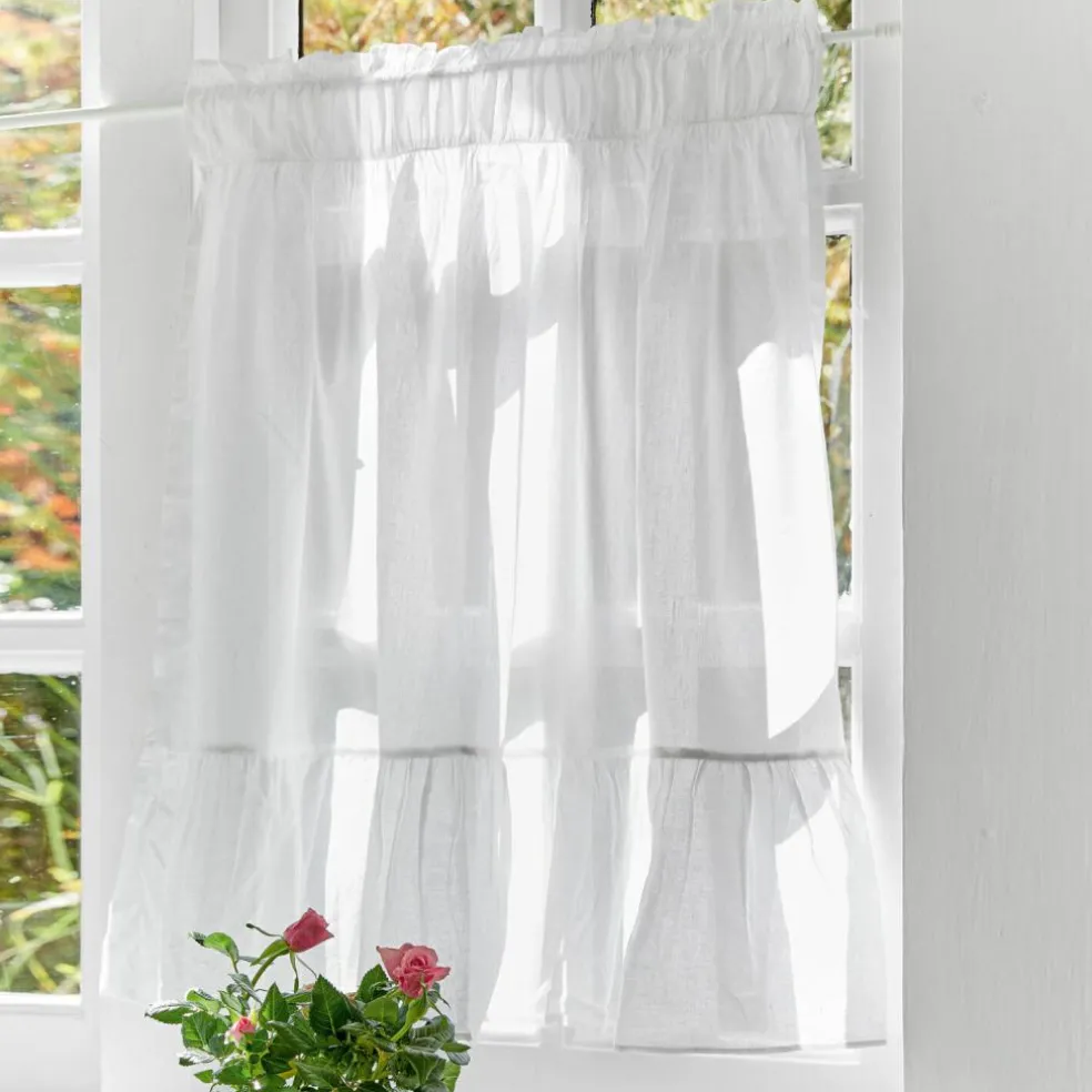 Wenn Sie ein romantisches Wohnambiente lieben, sollten Sie diese Scheibengardine in die Raumgestaltung mit einbeziehen. Sie ist ein hübscher Blickfang und verleiht Ihrem Fenster einen unverwechselbaren Ausdruck, ohne sich in den Vordergrund zu drängen. Dabei setzen verspielte Rüschen am oberen und unteren Saum den schmückenden Akzent. Das natürliche Gewebe aus reiner Baumwolle ist weich fließend und fein genug, um das Tageslicht angenehm mild durchscheinen zu lassen. So bewahrt der Raum seine Helligkeit und Ihre Pflanzen oder besonderen Dekostücke auf dem Fensterbrett erhalten ausreichend Freiraum, um sich wirkungsvoll in Szene zu setzen. Dank einem Tunnelsaum lässt sich das Textil ganz unkompliziert auf die Vorhangstange aufziehen und auf Wunschhöhe am Fenster anbringen. Ein stimmungsvoller Dekoakzent für traumhafte Küchen oder Badezimmer.
