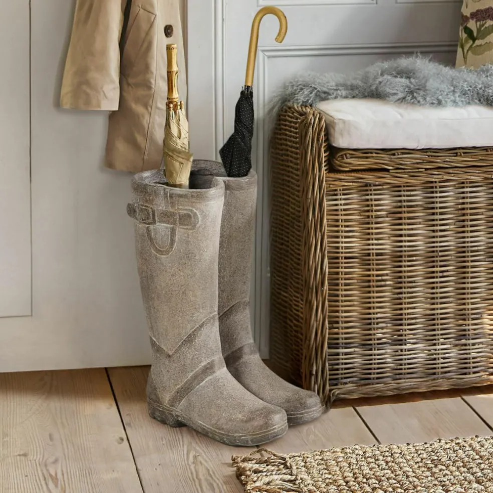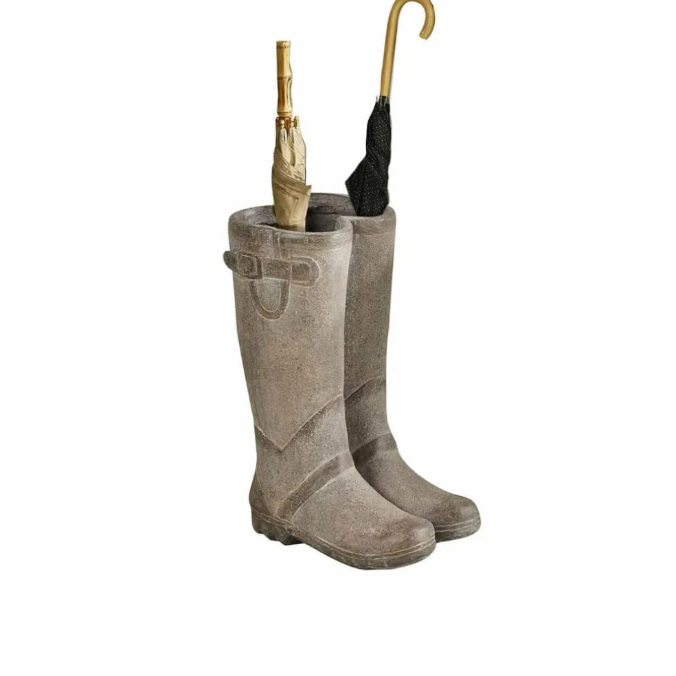Dieser außergewöhnliche Schirmständer verleiht Ihrem Eingangsbereich eine charmante, ländlich inspirierte Note. Die kunstvoll nachempfundene Form klassischer Stiefel erinnert an Spaziergänge durch herbstliche Wälder und bringt eine verspielte, nostalgische Stimmung in Ihr Zuhause. Durch das sanfte Antikgrau-Finish entsteht der Eindruck eines geliebten Erbstücks mit Charakter. Die detailreiche Oberfläche unterstreicht die authentische Optik und lässt ihn fast wie ein echtes Paar Stiefel wirken. Gefertigt aus widerstandsfähigem Polyresin, ist er ideal für nasse Regenschirme oder Spazierstöcke – ein charmantes und zugleich funktionales Accessoire für jeden Flur.